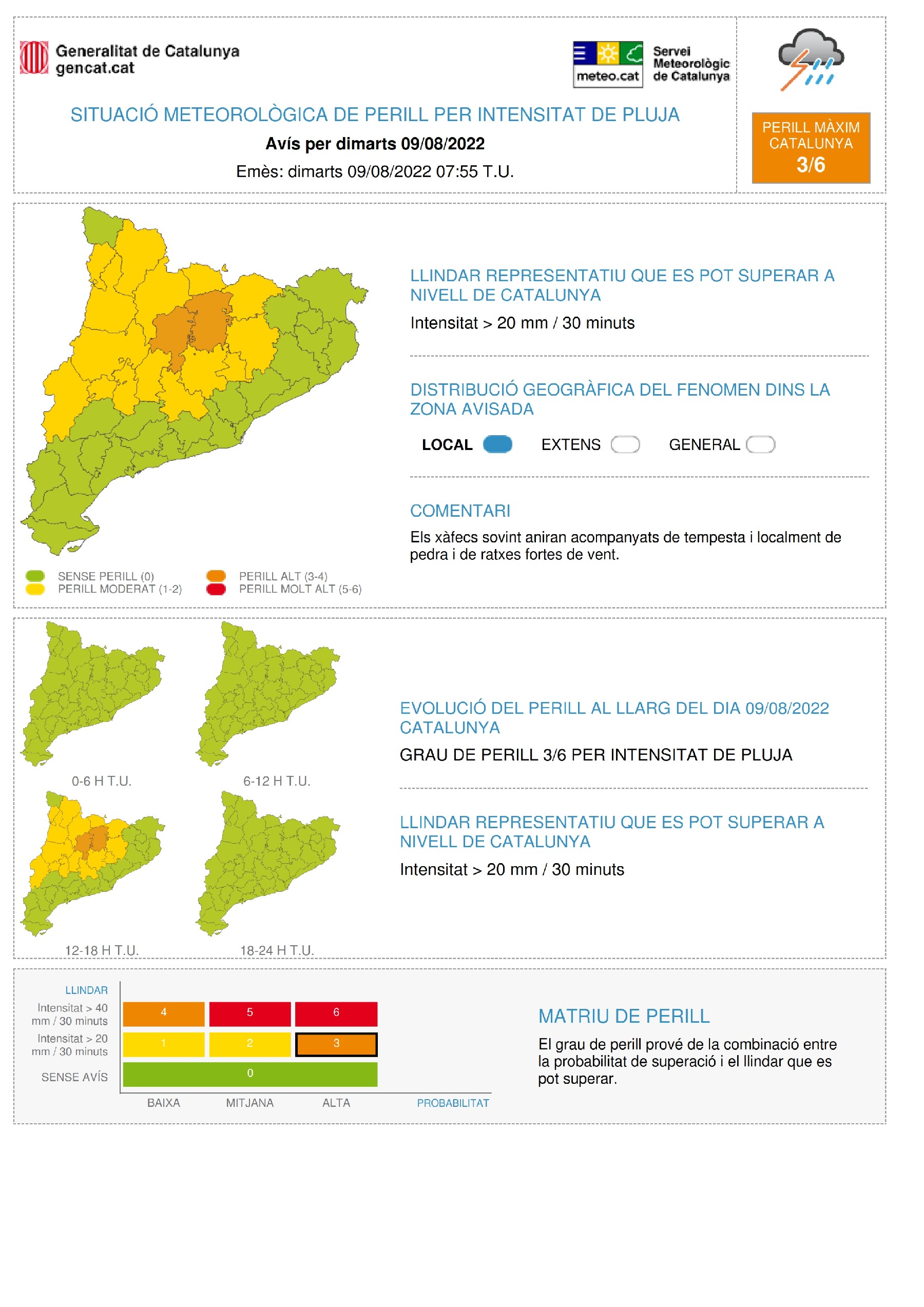 Protecció Civil activa l'alerta del Pla INUNCAT per les pluges intenses previstes aquesta tarda. El Meteocat preveu que les pluges superin els 20 l/m2 en 30 minuts al Pirineu, Prepirineu, Catalunya Central i Ponent