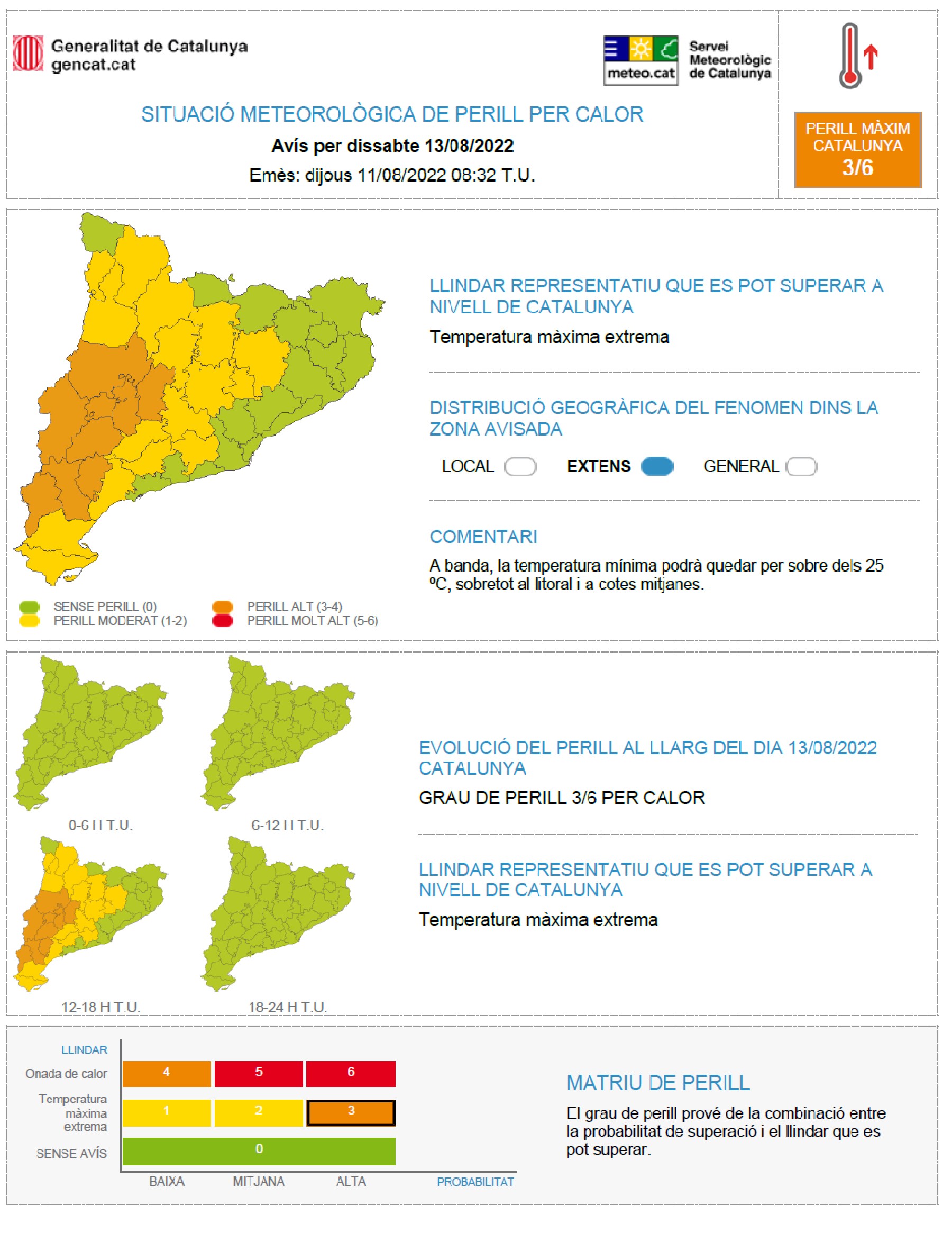Avisos de situació de perill per calor a Catalunya i per tempestes al sector oriental dels Pirineus fins dissabte. La temperatura màxima podrà pujar aquest divendres fins a 5 ºC, sobretot a trams del litoral i prelitoral central i nord