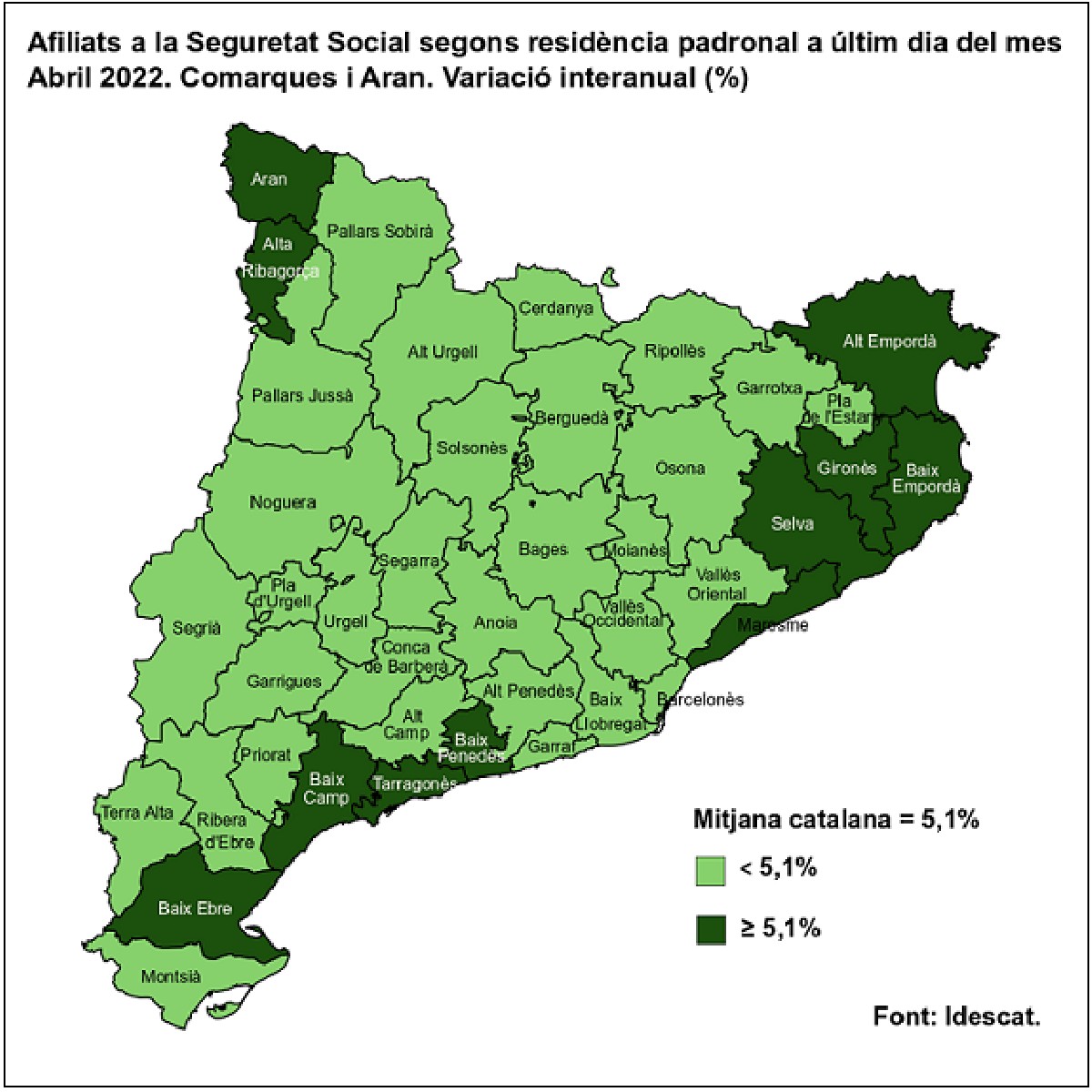 Els afiliats a la Seguretat Social augmenten a totes les comarques a l'abril, en relació amb l'any anterior. La variació mensual és positiva a 37 comarques