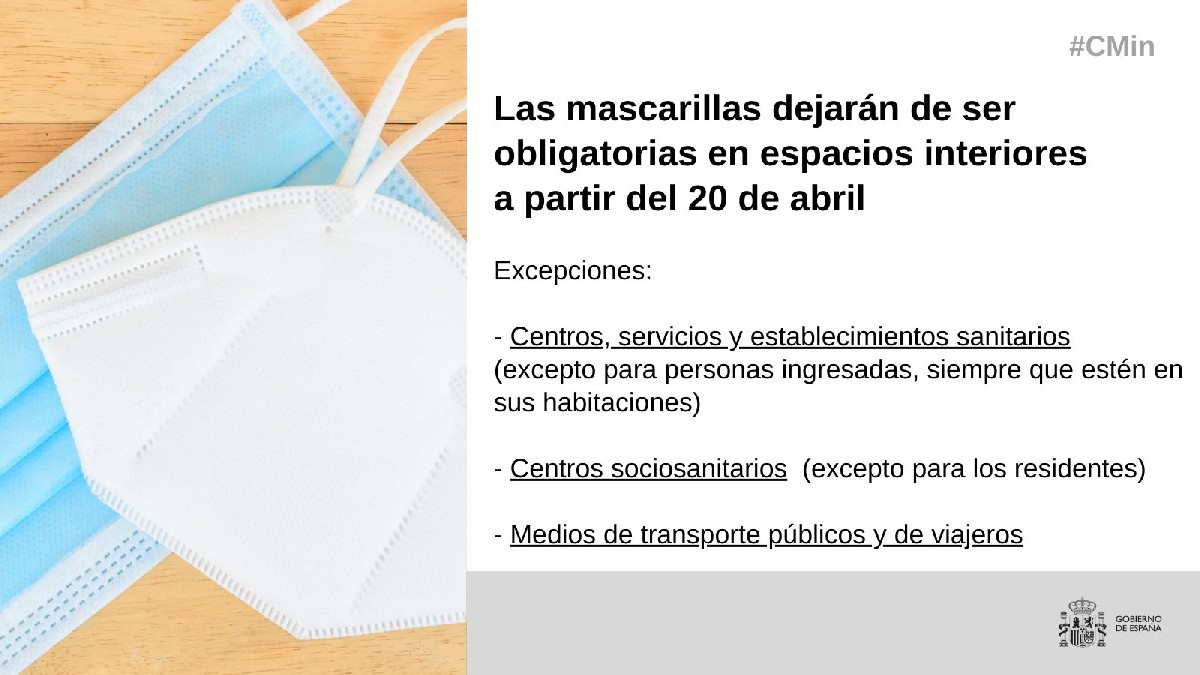 El govern espanyol aprova la fi de la mascareta en interiors amb l'excepció de transports, hospitals i farmàcies. En els centres de treball els serveis de prevenció de riscos laborals poden determinar que s'usi en espais tancats