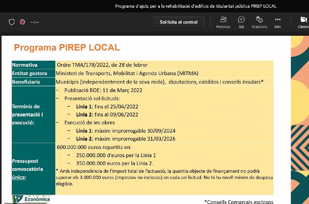 La Diputació assessora els ajuntaments del territori per accedir a la nova línia d'ajuts europeus PIREP LOCAL. Finançada per fons Next Generation EU, està destinada específicament a la rehabilitació sostenible del parc públic institucional