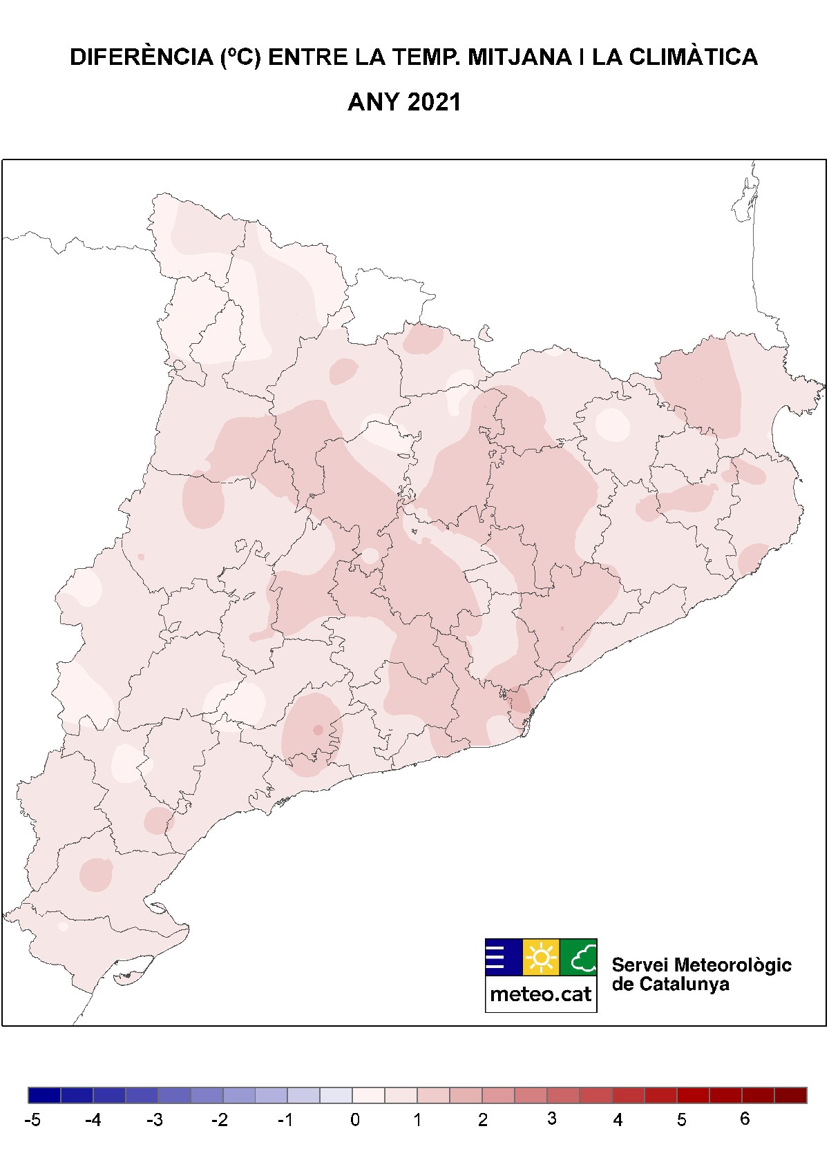 El 2021 va ser càlid i sec a gairebé tot Catalunya. L'anomalia de temperatura és d'entre 1,3 i 1,4 graus per sobre de la mitjana però lluny de l'excepcionalitat del 2020