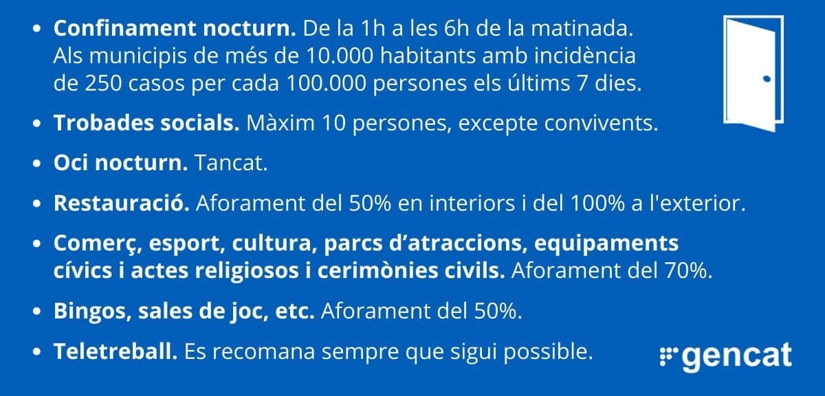 El Govern demanarà al TSJC prorrogar 14 dies més les restriccions vigents, amb toc de queda a 124 municipis. Es manté la limitació de les bombolles, els aforaments, el tancament de l'oci nocturn i la recomanació de teletreballar