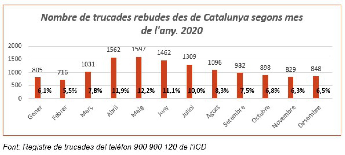 El servei 900 900 120 d'atenció a dones en situació de violència masclista va rebre l'any passat un 24,5% més trucades. Els mesos amb més trucades han estat els d'abril, maig i juny coincidint amb el confinament estricte i la desescalada