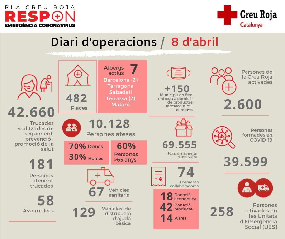 La Creu Roja inicia la compra urgent d'aliments per valor d'1,5 MEUR davant un augment de la demanda del 25%. L'entitat preveu per que en els propers mesos atendrà el doble de persones que abans de la crisi de la covid-19