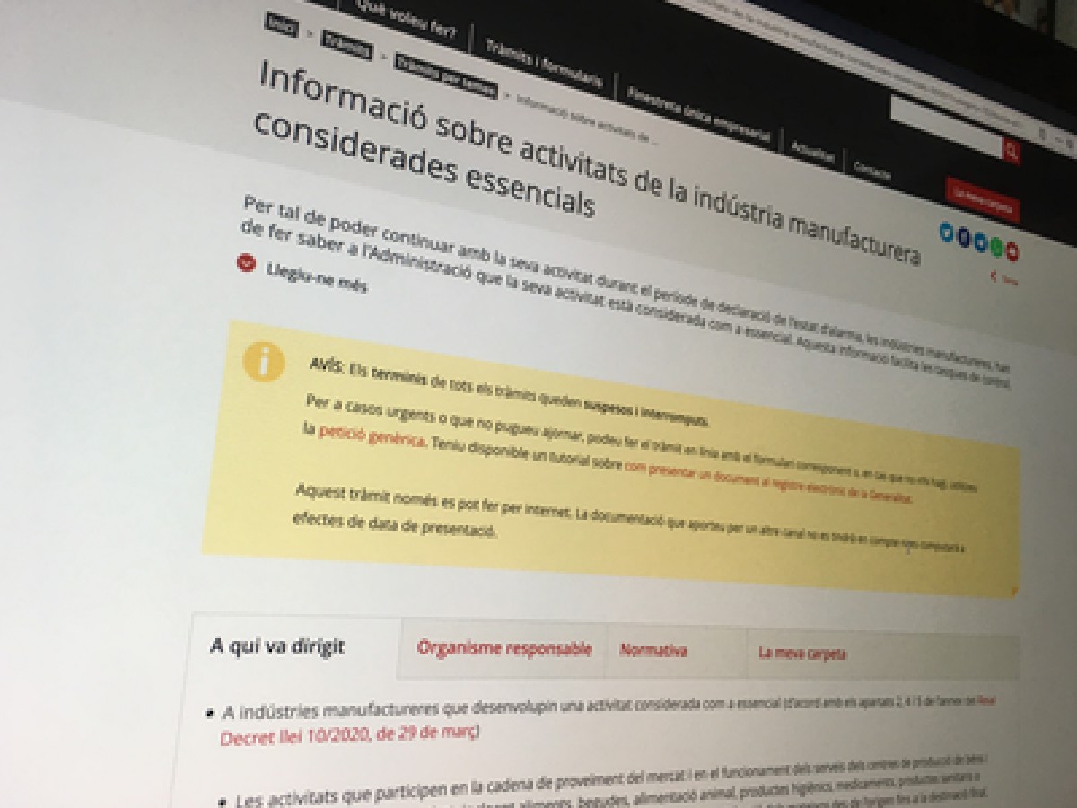 El Govern defineix un procediment per garantir que les empreses industrials essencials puguin desenvolupar la seva activitat durant la crisi sanitària de la COVID19