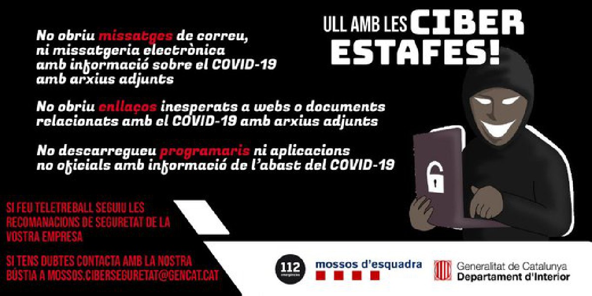 Alerten d'un increment del cibercrim aprofitant el teletreball i la necessitat d'obtenir informació sobre el coronavirus. Els Mossos recomanen incrementar les mesures de seguretat i desconfiar dels correus i missatges de mòbil