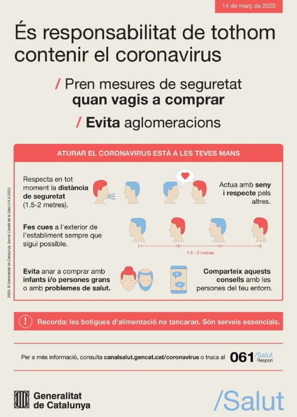 El Govern demana sortir al carrer només quan sigui imprescindible i insisteix que el proveïment està garantit. Reclama que no hi hagi mobilitat arreu de Catalunya