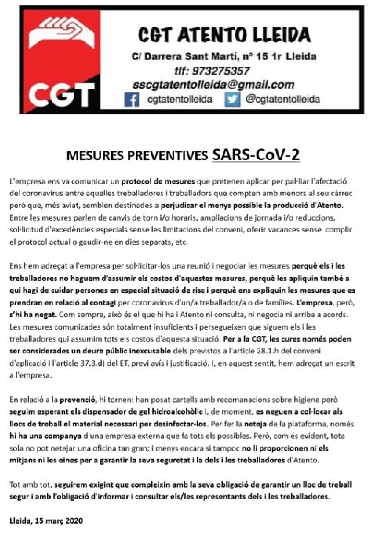 CGT a Lleida denúncia la situació que pateixen els treballadors de l'empresa Atento Teleservicios als qui no s'ha donat l'opció de treballar a casa malgrat estar aplegats més de 200 persones a 0,5 metres de distància