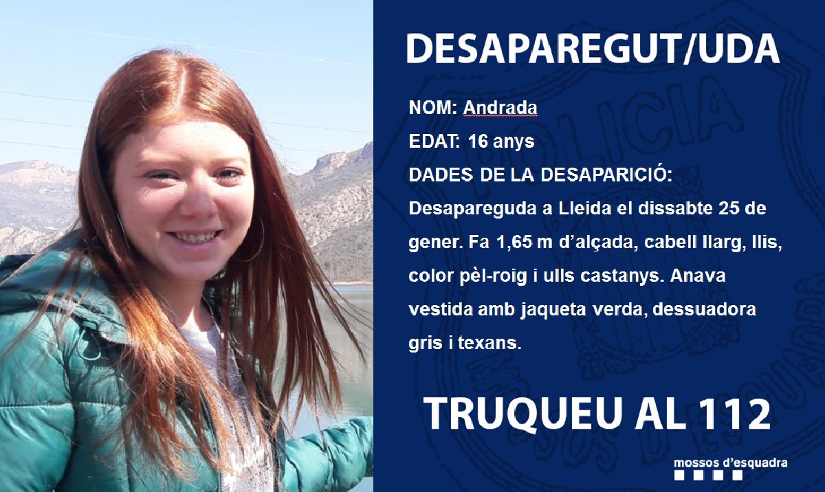 Busquen una noia de 16 anys desapareguda dissabte a Lleida. Els Mossos demanen la col·laboració de la ciutadania a través de Twitter