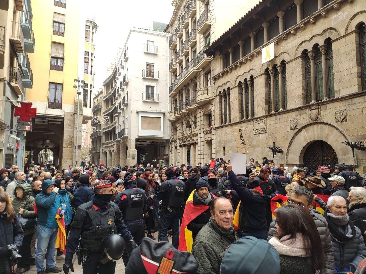 Uns 150 antifeixistes es manifesten contra l'acte de Vox a Lleida. La cinquantena de manifestants del partit d'ultradreta no han llegit el manifest i han sortit escortats de la Plaça de la Paeria