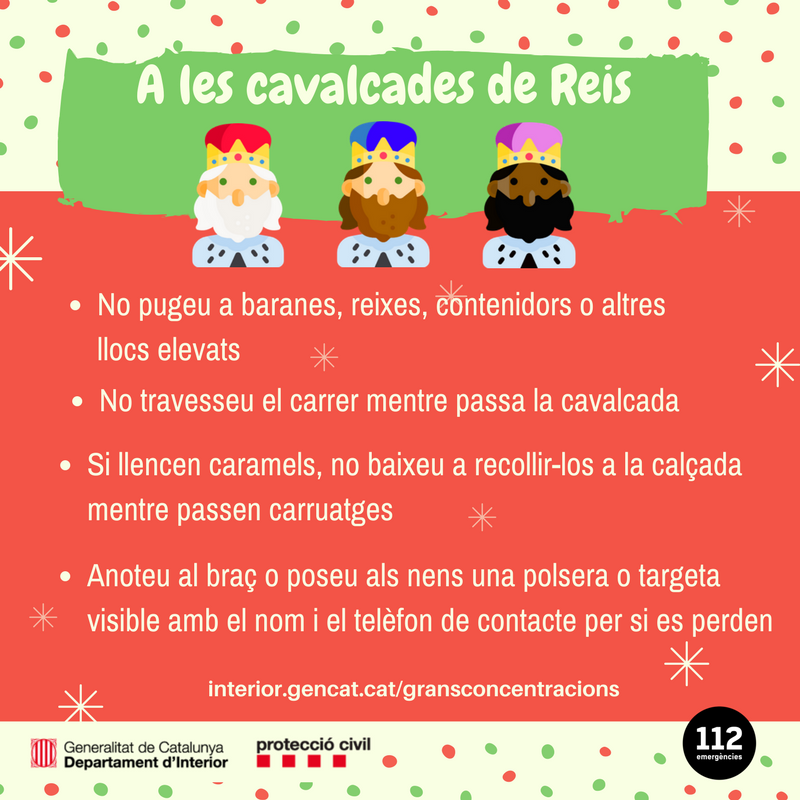 Consells de Protecció Civil de la Generalitat per a una cavalcada de Reis segura. Des del twitter @emergenciescat amb l'etiqueta #cavalcadasegura, Protecció Civil informarà dels principals consells i possibles incidències