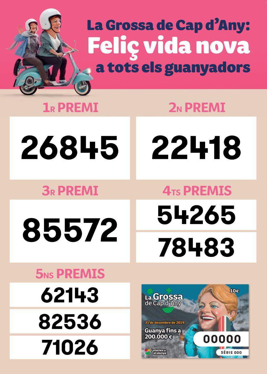 La Grossa de Cap d'Any, el 26845, toca a Terrassa, Salt, Barcelona, Palafolls, Sant Boi de Llobregat i Santa Susanna. Són 200.000 euros per cada bitllet