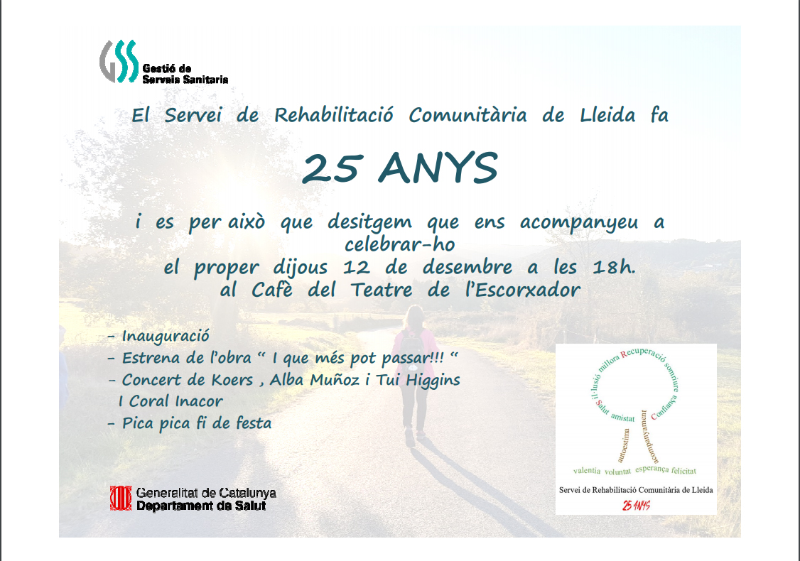 Festa dels 25 anys del Servei de Rehabilitació Comunitària de Lleida aquest dijous a Lleida amb teatre i concerts. La Regió Sanitària Lleida disposa de SRC a les ciutats de Lleida, Balaguer i Tàrrega