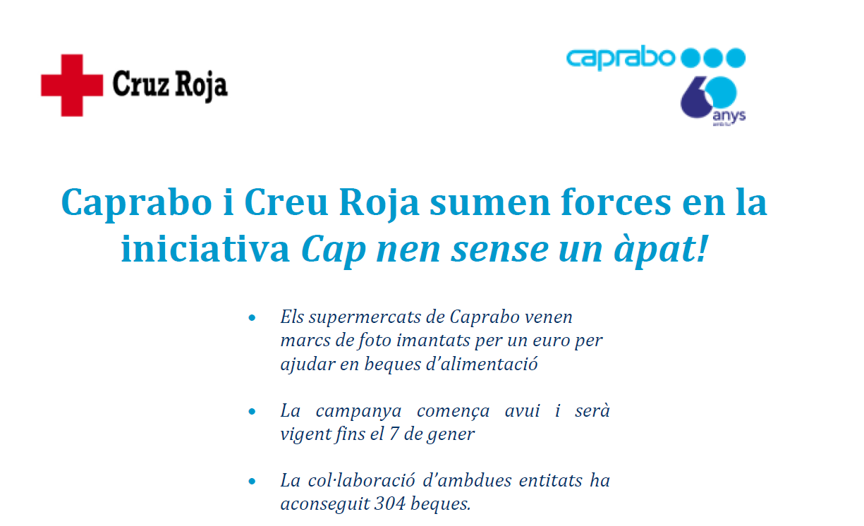 Caprabo i Creu Roja sumen forces en la iniciativa Cap nen sense un àpat! Els supermercats venen marcs de foto imantats per un euro per ajudar en beques d'alimentació. La campanya comença avui i serà vigent fins el 7 de gener