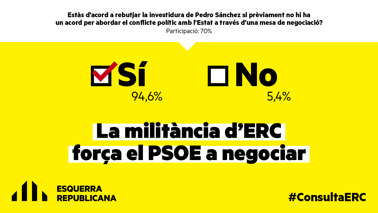ERC rebutja investir Sánchez si abans no hi ha un acord per una taula de negociació amb el 94,6% dels vots. La participació a la consulta interna ha estat del 70%, 5.953 militants