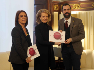 El 72,4 % dels alumnes del Consorci per a la Normalització Lingüística han nascut a l'estranger. La consellera Vilallonga i la directora general de Política Lingüística lliuren l'Informe de Política Lingüística de 2018 al president del Parlament
