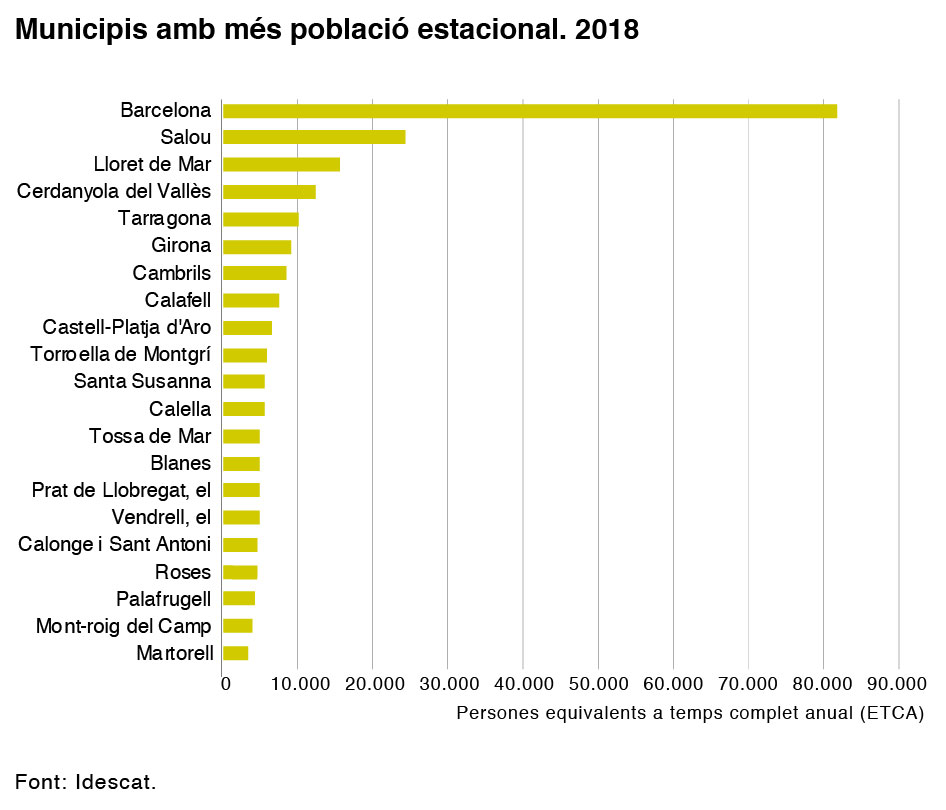 La població estacional disminueix a pràcticament totes les comarques l'any 2018. La població estacional és el saldo entre les entrades a un municipi de persones que no hi resideixen i les sortides de les persones que hi resideixen