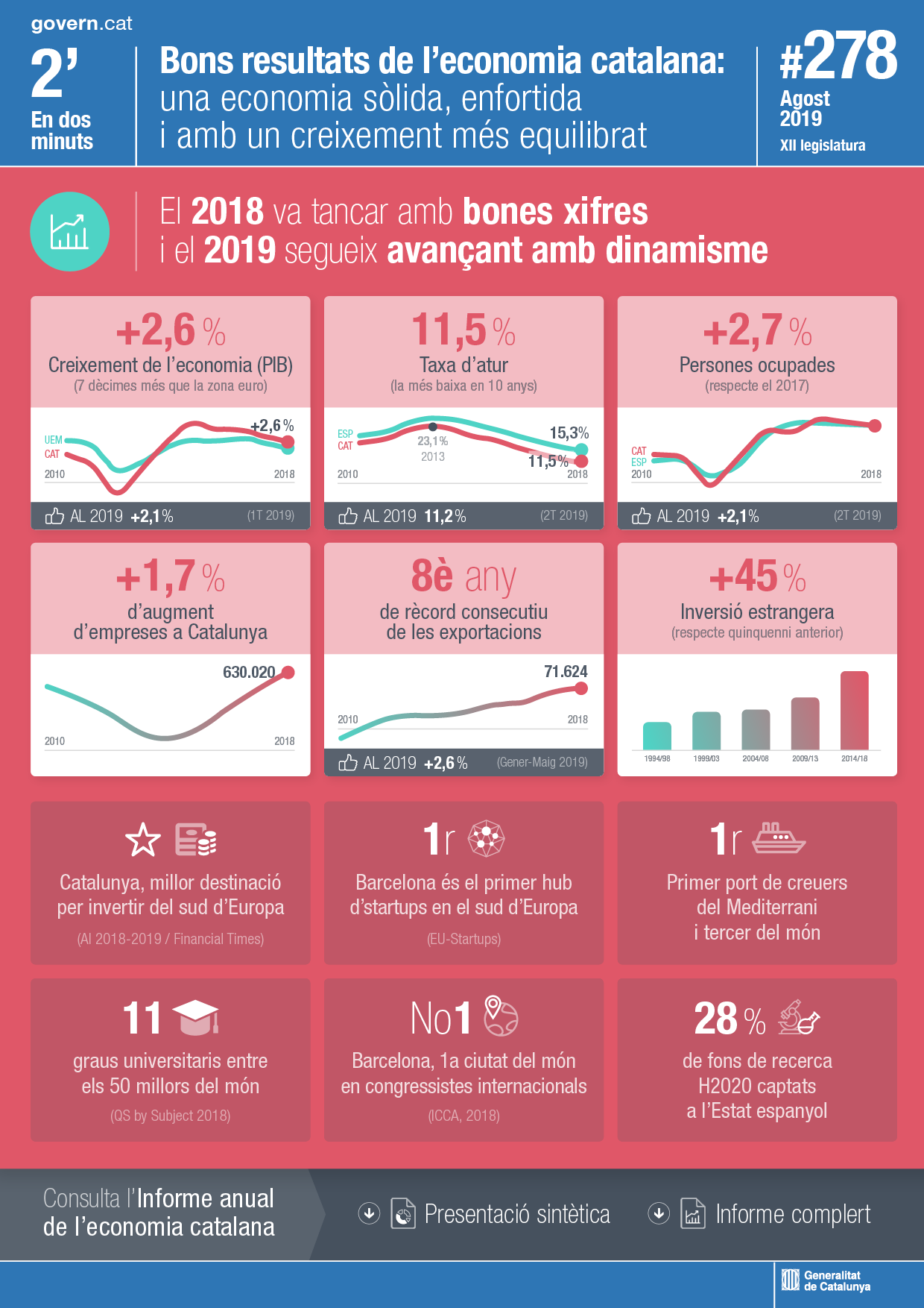 El Govern considera que l'economia catalana avança "amb dinamisme" en créixer un 2,6% el 2018. Les "bones xifres" de l'any passat se situen per sobre de la mitjana de la zona euro