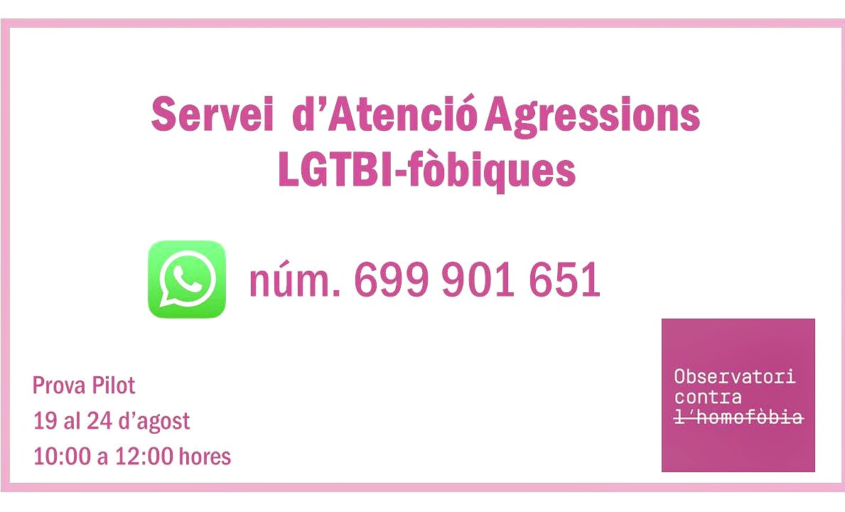 L'Observatori contra l'Homofòbia posa en marxa el whatsapp per atendre víctimes d'agressions LGTBI-fòbiques. El servei estarà fins dissabte en fase de prova pilot.