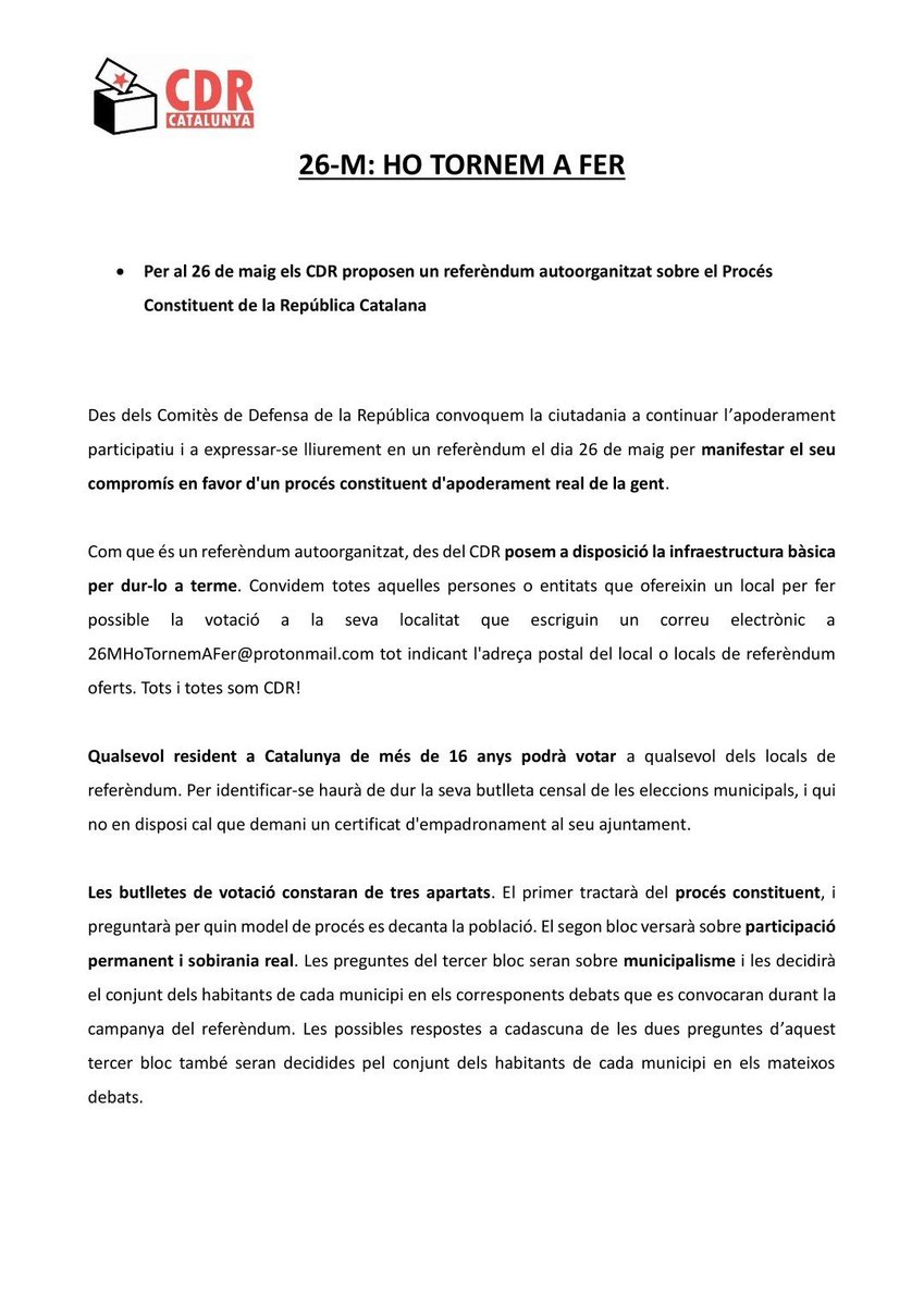 Els CDR proposen celebrar un referèndum sobre el Procés Constituent coincidint amb les eleccions municipals. Fan una crida a persones i entitats per oferir locals, on es podrà votar amb la butlleta censal del 26-M