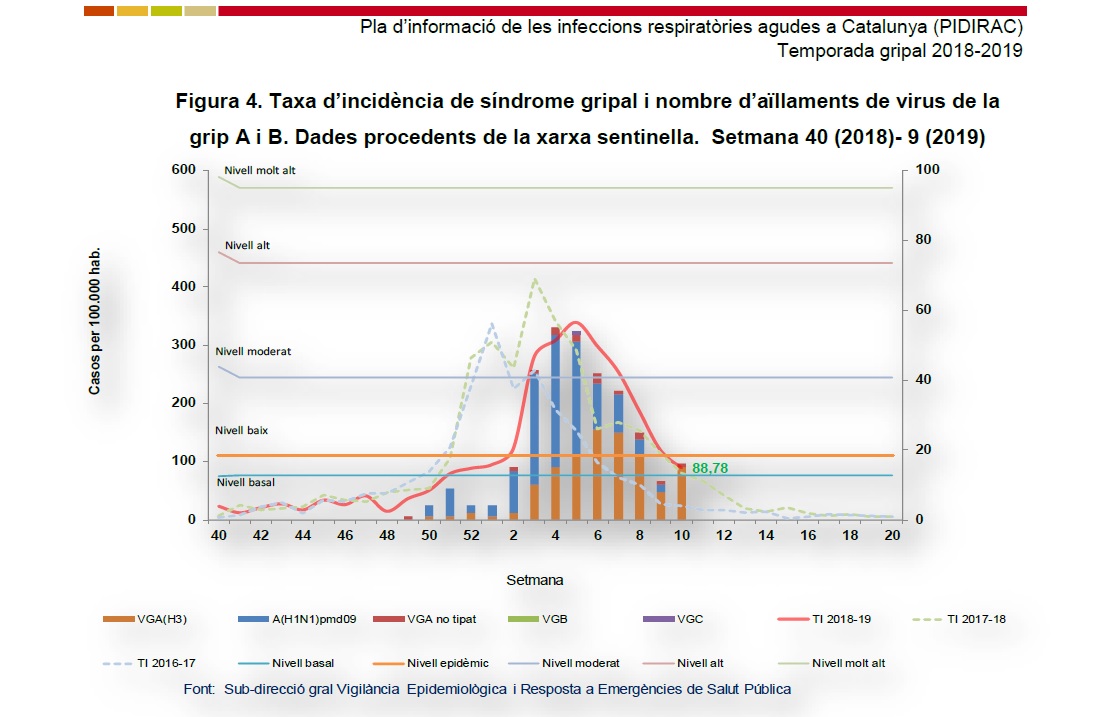 S'acaba l'epidèmia de grip a Catalunya. La taxa d'incidència ha continuat baixant fins arribar als 88,78 casos per 100.000 habitants, per sota del llindar epidèmic establert per aquesta temporada als 110,7 casos