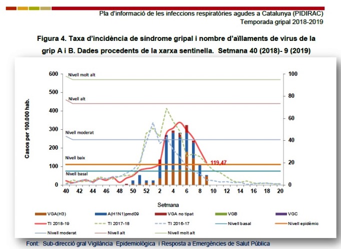 Catalunya frega la finalització de l'epidèmia de grip. La taxa d'incidència segueix baixant i se situa ja en 119,47 casos per 100.000 habitants, a tocar del llindar epidèmic de 110,7 casos establert per aquesta temporada