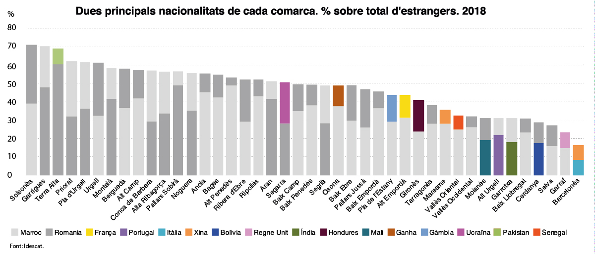 1.082.099 estrangers resideixen a Catalunya el 2018, un 3,9% més que l'any anterior segons les dades del IDESCAT. La Segarra, és la comarca amb un percentatge més elevat, el 26,0%. A la Noguera és d'un 16,1%
