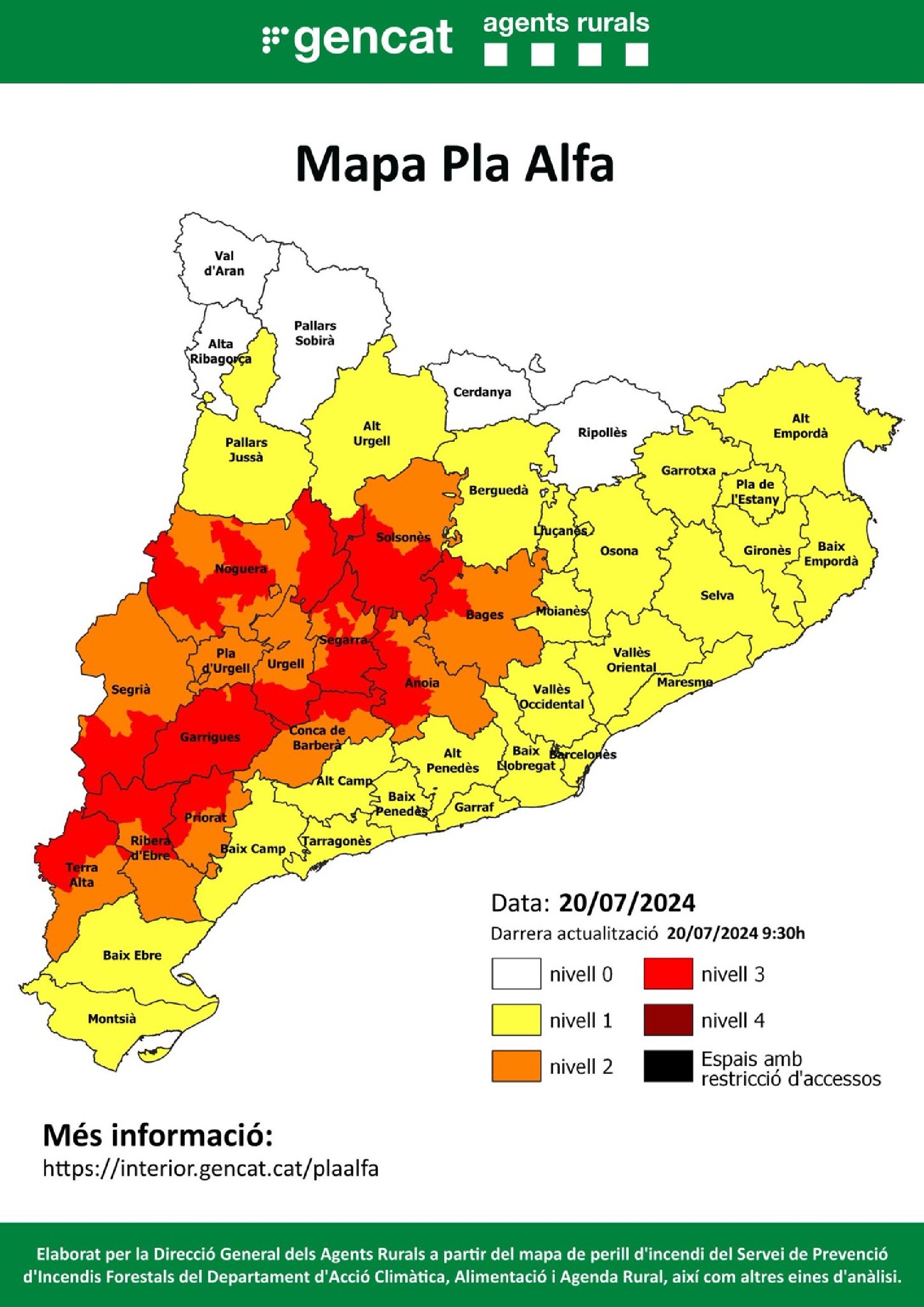 Activat el nivell 3 del Pla Alfa per perill molt alt d'incendi forestal a 118 municipis de 13 comarques. Els Agents Rurals demanen 'molta precaució' i queden prohibides totes les activitats de risc