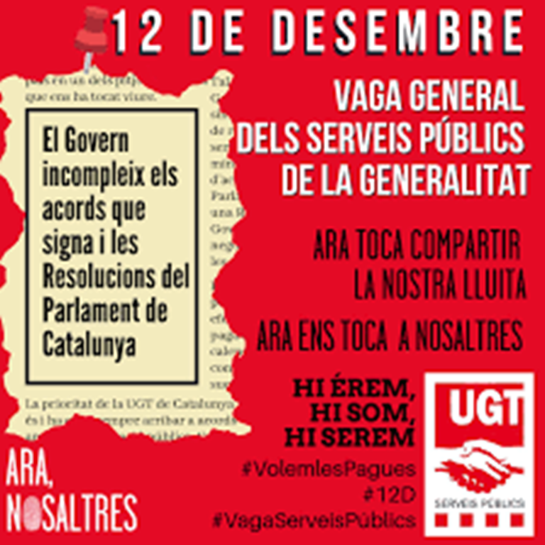 CCOO i UGT mantenen la vaga de funcionaris del 12 de desembre després de set hores de mediació amb la Generalitat. Les parts seguiran negociant el retorn de les pagues extres pendents aquest dimarts a les 11 hores.