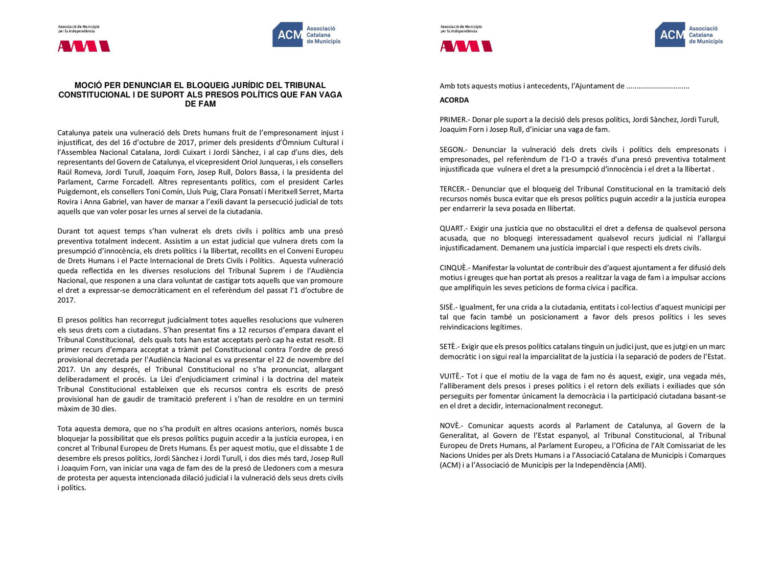 L'ACM i l'AMI envien mocions als ajuntaments per denunciar que el TC bloqueja l'accés a la justícia europea