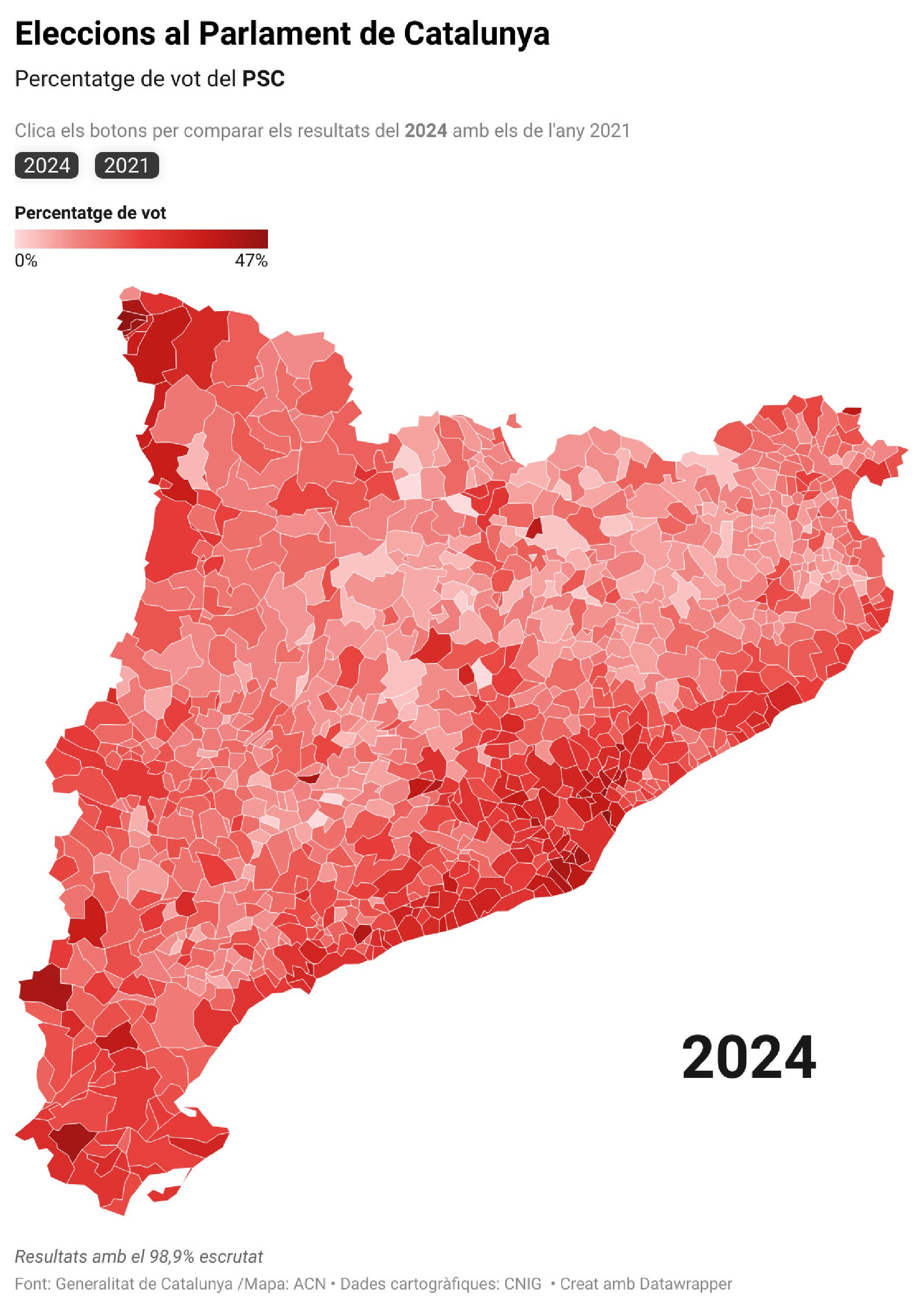 El PSC guanya amb 42 escons i Junts se situa en segona posició superant ERC per 15, amb el 99% escrutat. Els republicans perden 13 diputats i Aliança Catalana entra al Parlament amb 2