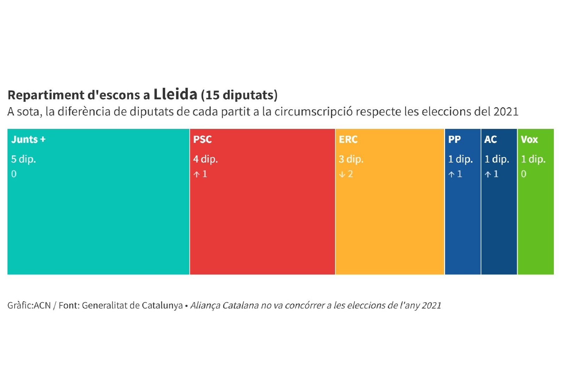 Junts s'imposa a la demarcació de Lleida amb 5 diputats i el PSC amb 4 supera ERC que es queda amb 3. La novetat és Aliança Catalana mentre que el PP recupera l'escó perdut al 2015, Vox manté el seu i cau el de la CUP