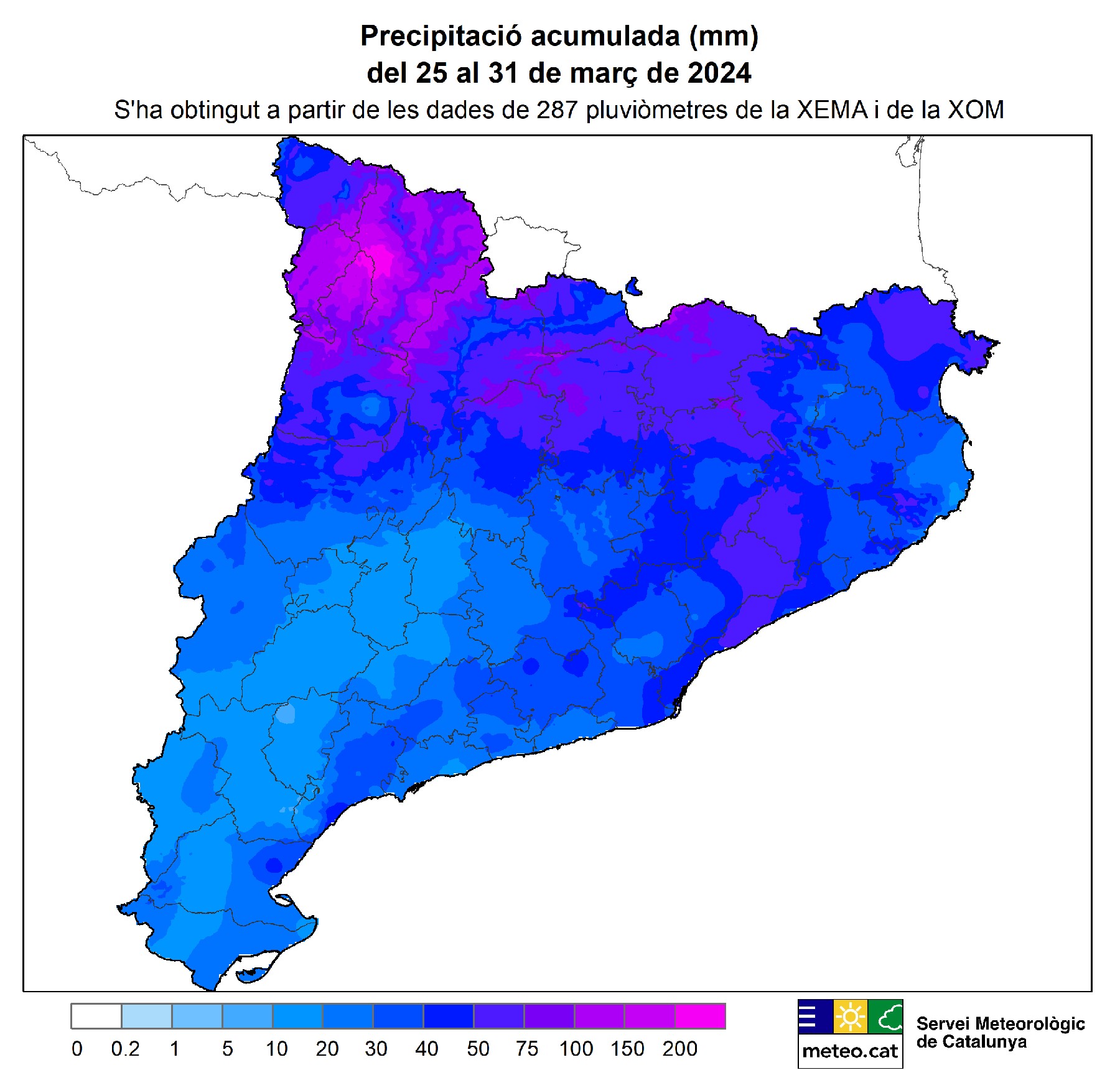 Les pluges de Setmana Santa deixen més de 50 l/m2 al Pirineu, Prepirineu, Montseny i sectors del Maresme i l'Alt Empordà. A les Terres de l'Ebre i Ponent s'han recollit entre 10 i 20 litres per metre quadrat