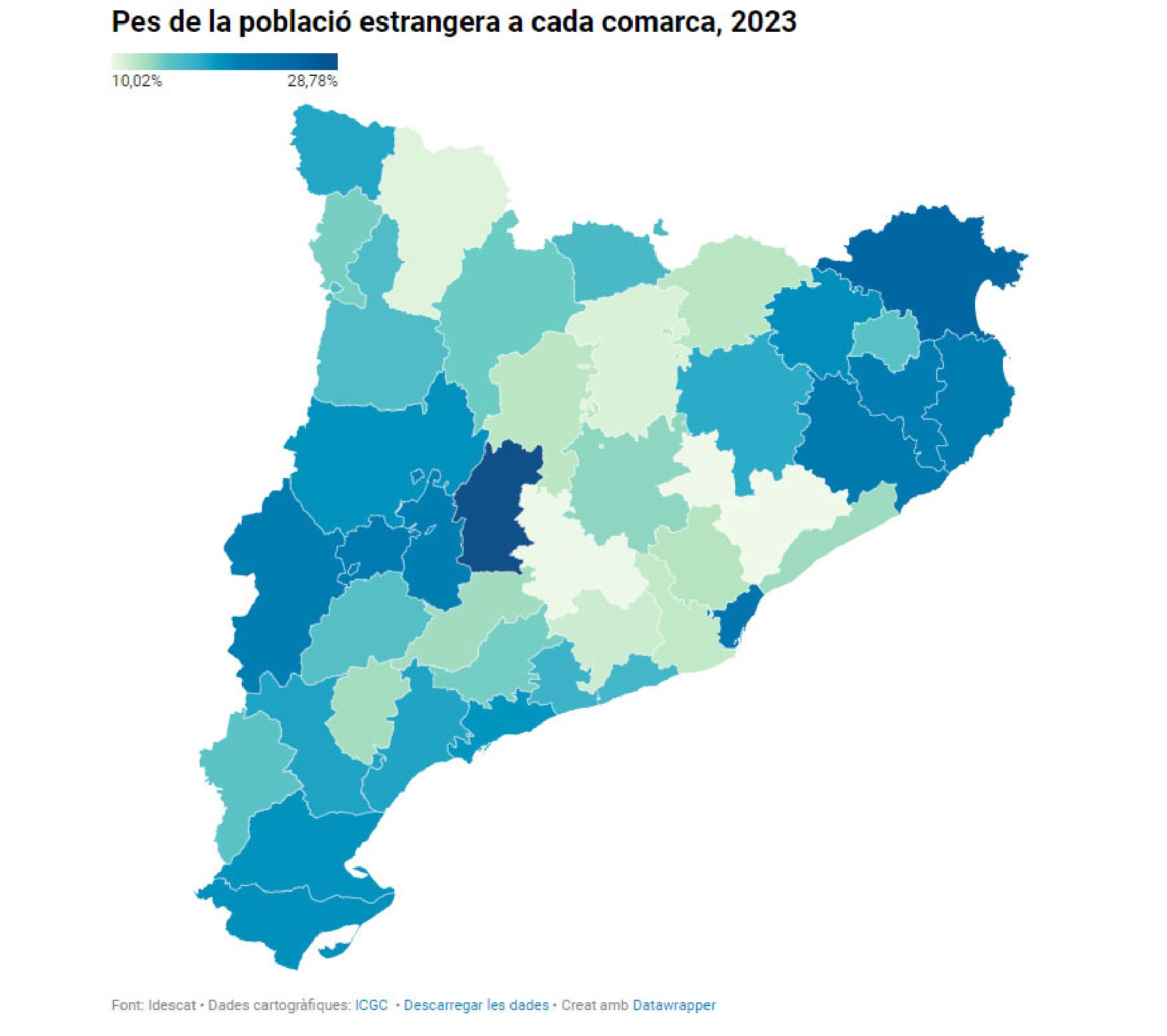 A Catalunya hi residien 1,3 milions d'estrangers el 2023, un 10% més que l'any anterior. Les comarques amb més població estrangera són la Segarra (29%), l'Alt Empordà (25%) i el Barcelonès (23%). A La Noguera són un 19.08%