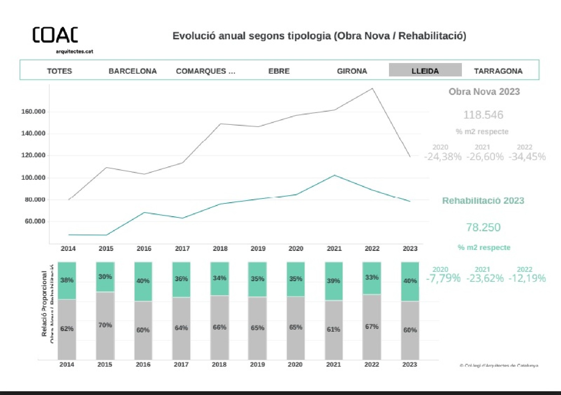 L'edificació a Lleida cau i se situa a nivells anteriors a la pandèmia. Després de 5 anys de creixement, la superfície total visada a la Demarcació de Lleida experimenta una davallada.
