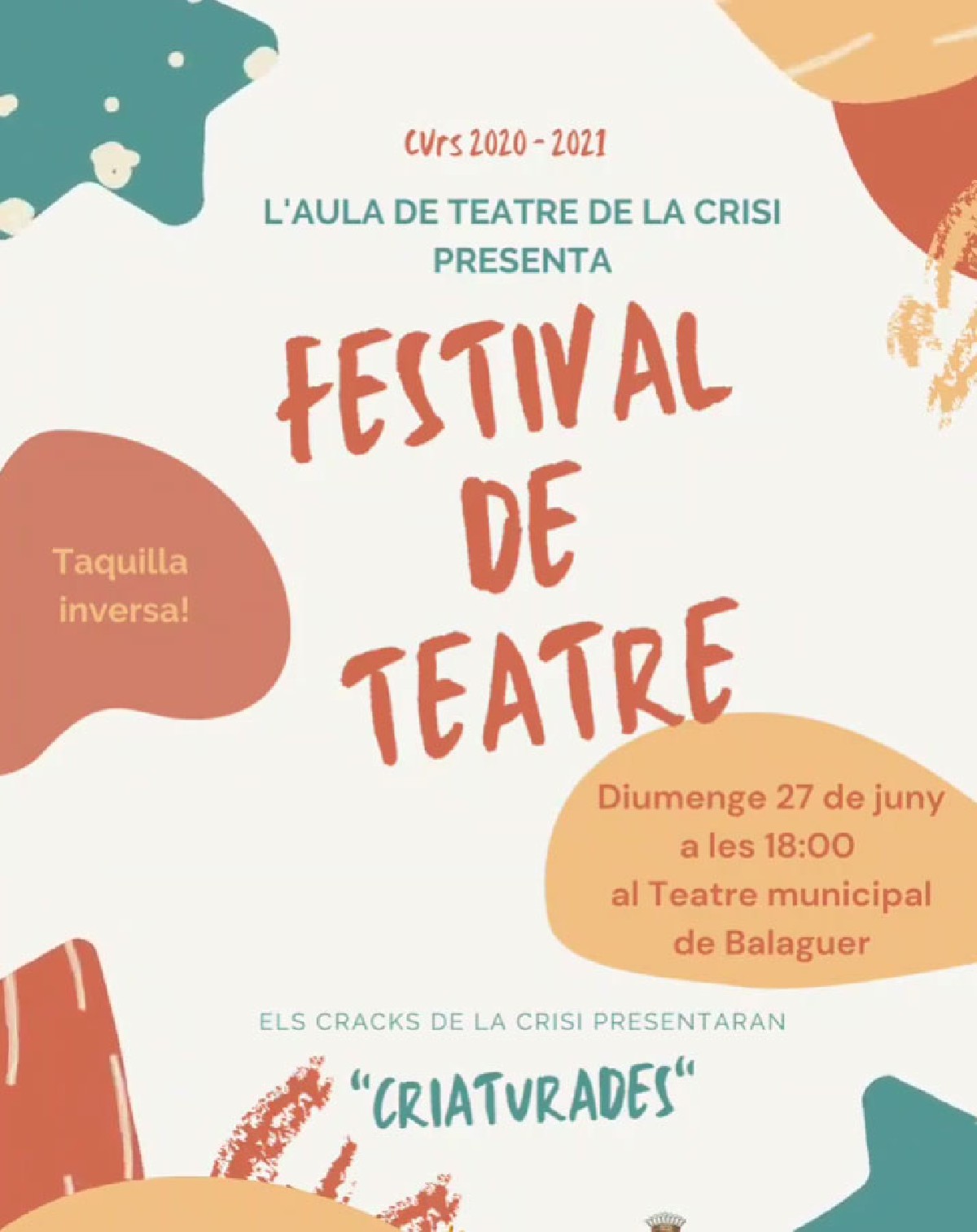 Els Cracks de la Crisi portaran al Teatre Municipal de Balaguer aquest diumenge l'obra ''Criaturades''. L'entrada a la funció que començarà a les 18h és gratuïta, i funcionarà amb el sistema de taquilla inversa