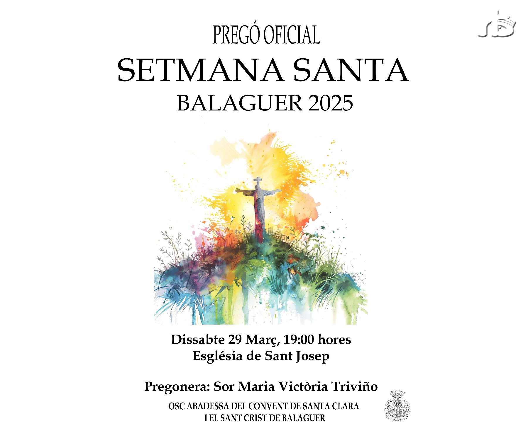 El pregó de la Setmana Santa de Balaguer d'enguany anirà a càrrec de l'Abadessa del Convent de Santa Clara de Balaguer. El pregó tindrà lloc el dissabte 29 de març a l'Església de Sant Josep