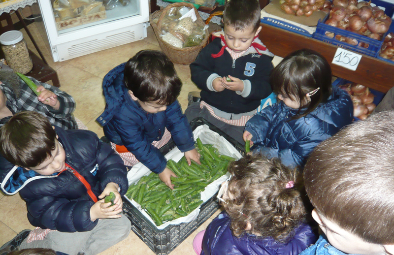 Els nens i nens de la llar d'infants Patufet de Balaguer visiten una fruiteria del barri per conèixer d'aprop les diferents fruites i verdures.