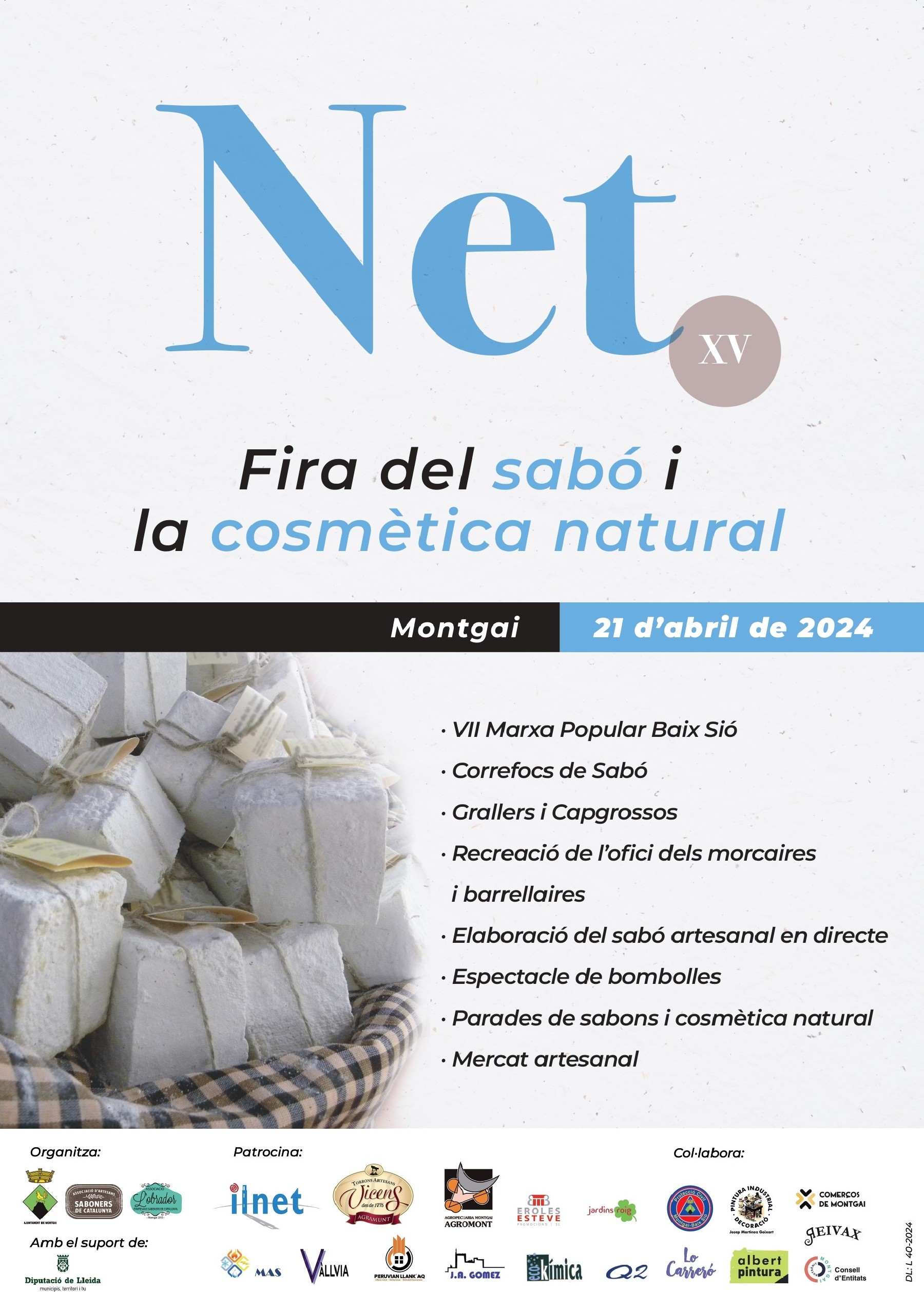 La XV edició de Net, la fira del Sabó i la Cosmètica Natural, se celebra enguany el 21 d'abril a Montgai, declarat Poble d'ofici singular del sabó, amb la consolidació del Corresabó, una proposta pionera a Catalunya