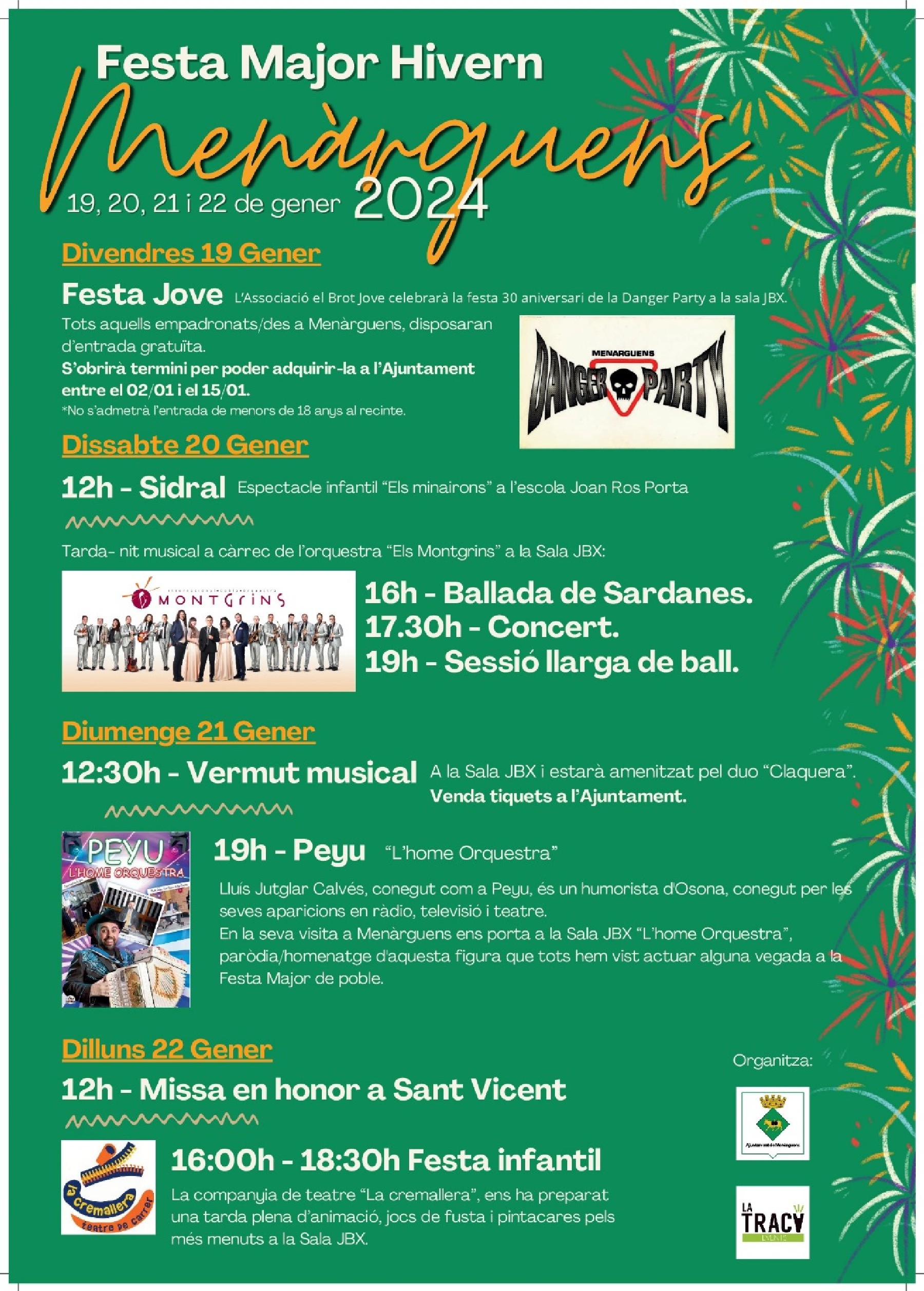 Menàrguens celebra aquest proper cap de setmana, del 19 al 22 de gener, la seva festa major d'hivern. Els actes comencen divendres recuperant la Danger Party i inclouen balls i espectacles familiars entre altres