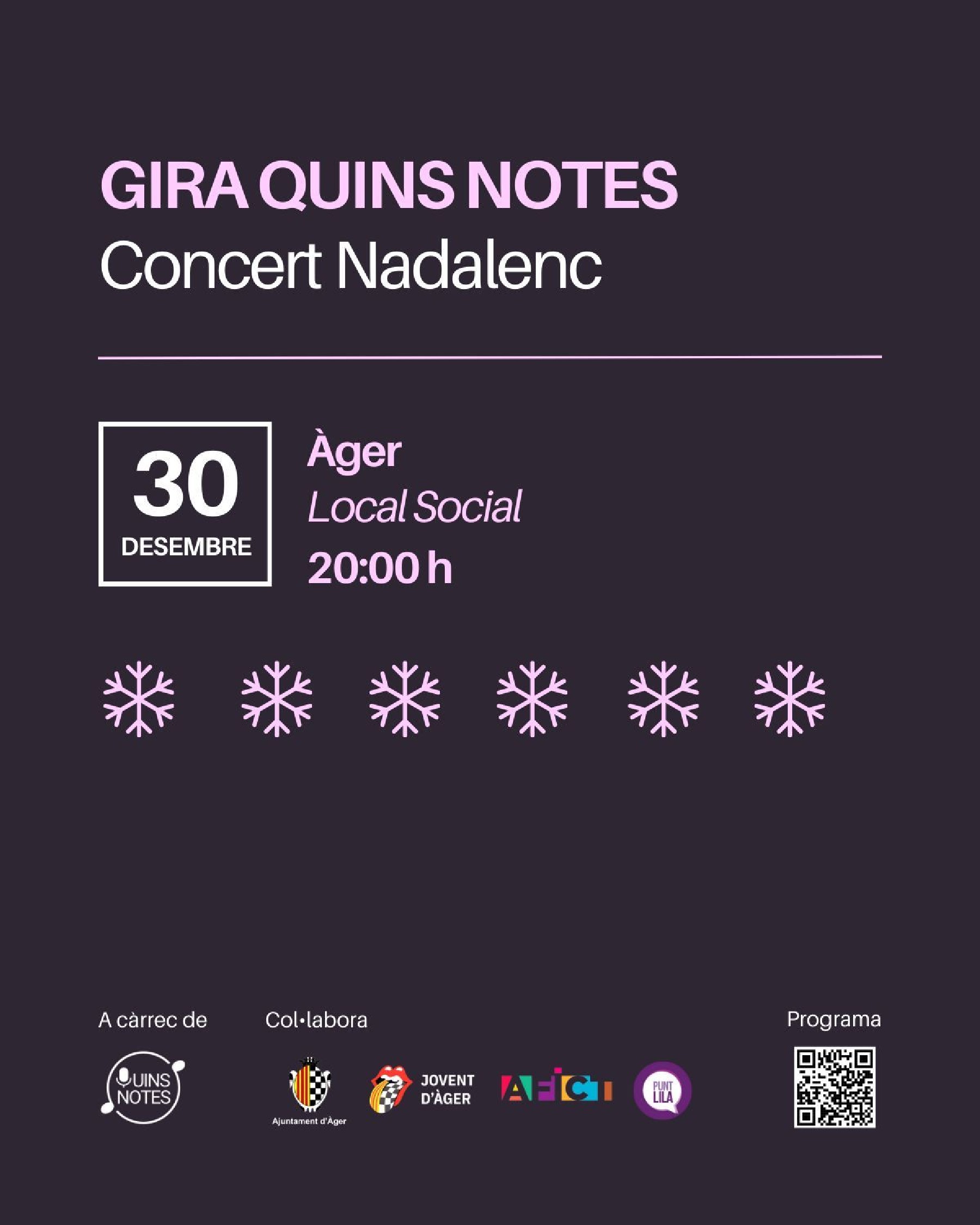 La mini gira Quins Notes farà parada aquest dissabte 30 de desembre al Local Social d'Àger. Es tracta d'un grup de joves músics que aquestes dates s'han unit per oferir un total de 5 recitals de Nadales, un d'aquests al municipi noguerenc