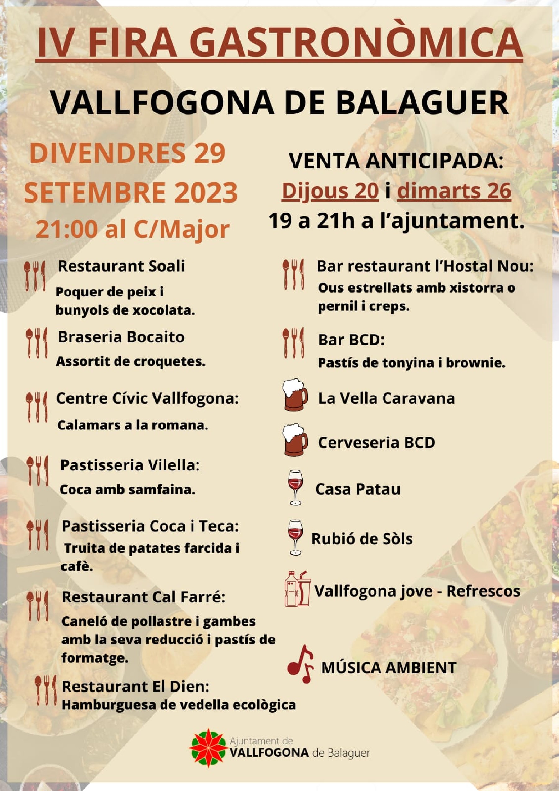 Vallfogona de Balaguer celebra aquest divendres, en el marc dels actes de la Festa Major, la 4a fira gastronòmica. Una quinzena d'establiments oferiran tapes i degustacions al carrer