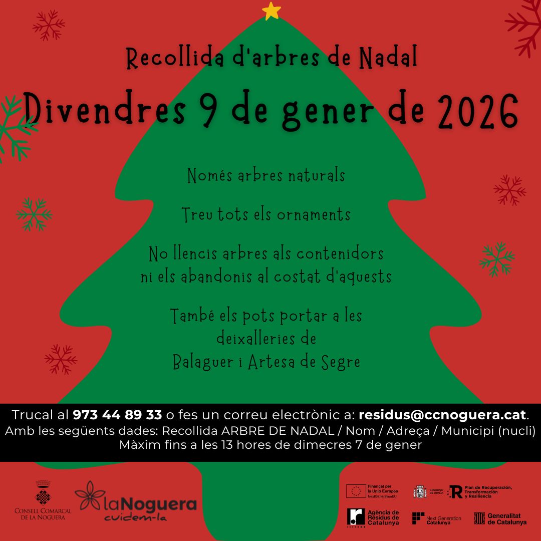 El Consell Comarcal de la Noguera programa una recollida d’arbres de Nadal després de les festes. Les peticions s’hauran de formalitzar com a màxim fins al dimecres 7 de gener