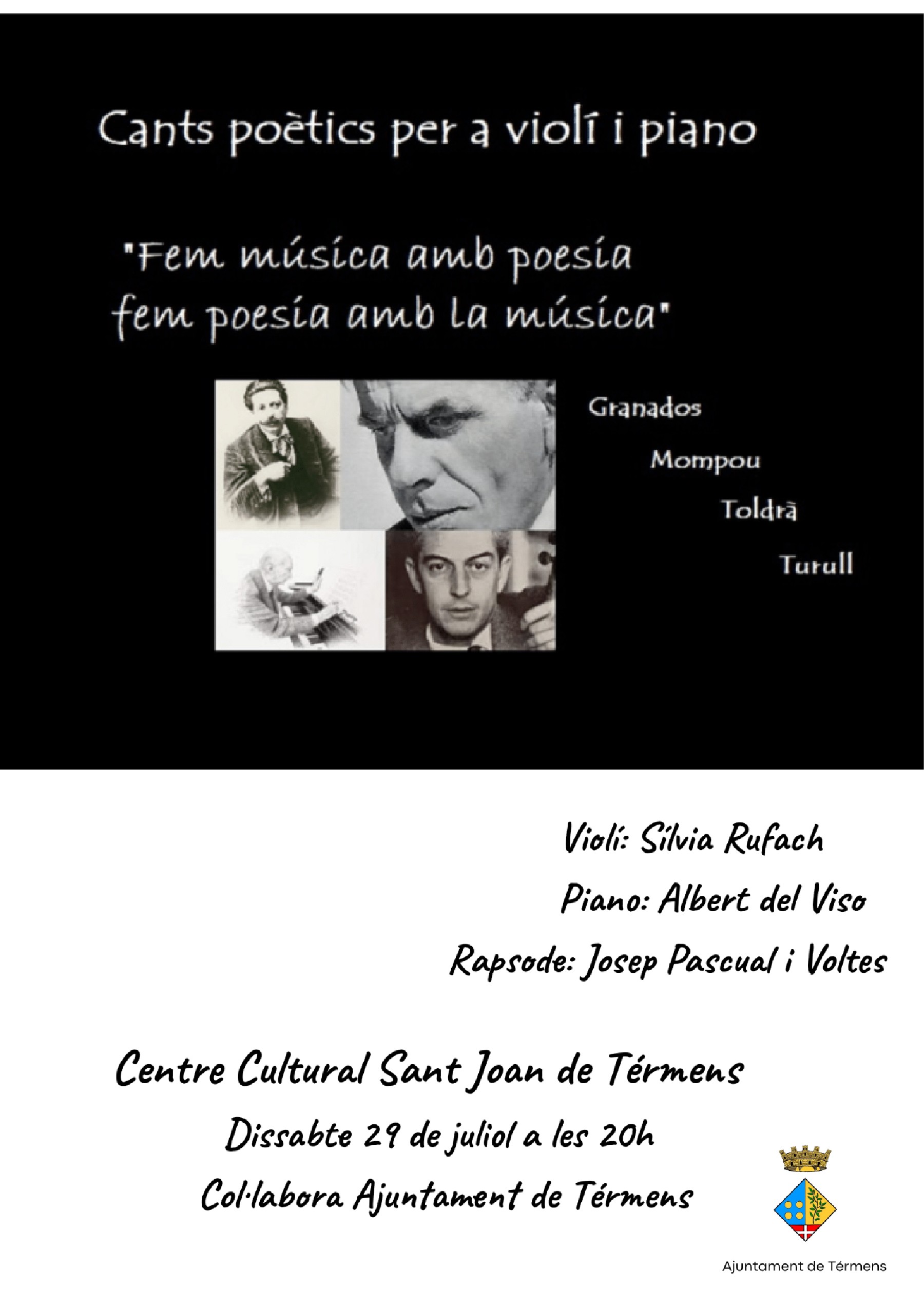 El Centre Cultural de Térmens acull aquest dissabte una vesprada dedicada als cants poètics amb violí i piano. Ho farà amb la presència de dos músics i un rapsoda