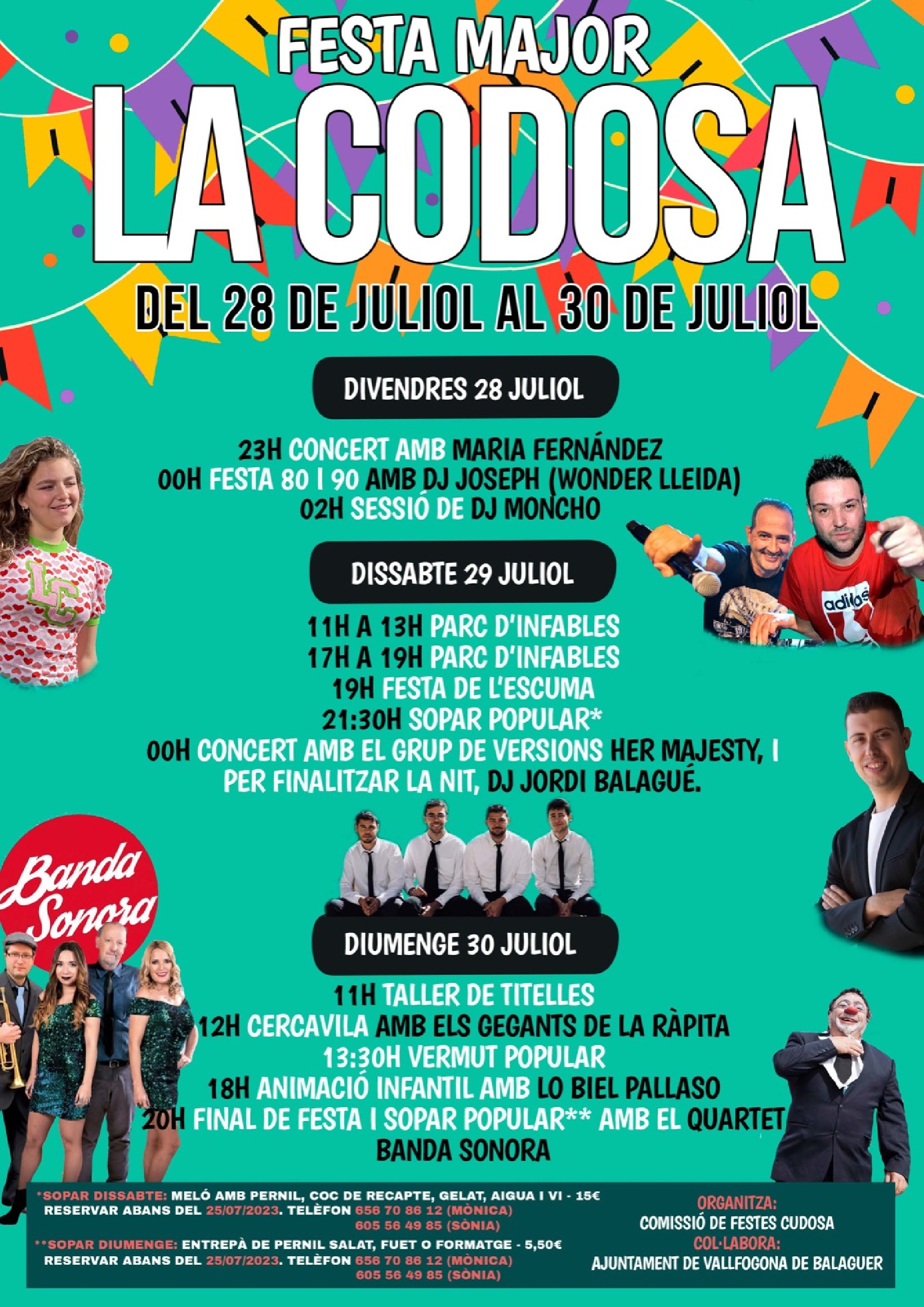 Cap de setmana de festa major a la Codosa amb un programa d'actes molt variat, que inclou concerts, espectacles infantils i molt més. En destaquen les sessions dels djs Joseph i Moncho i el concert de Her Majesty