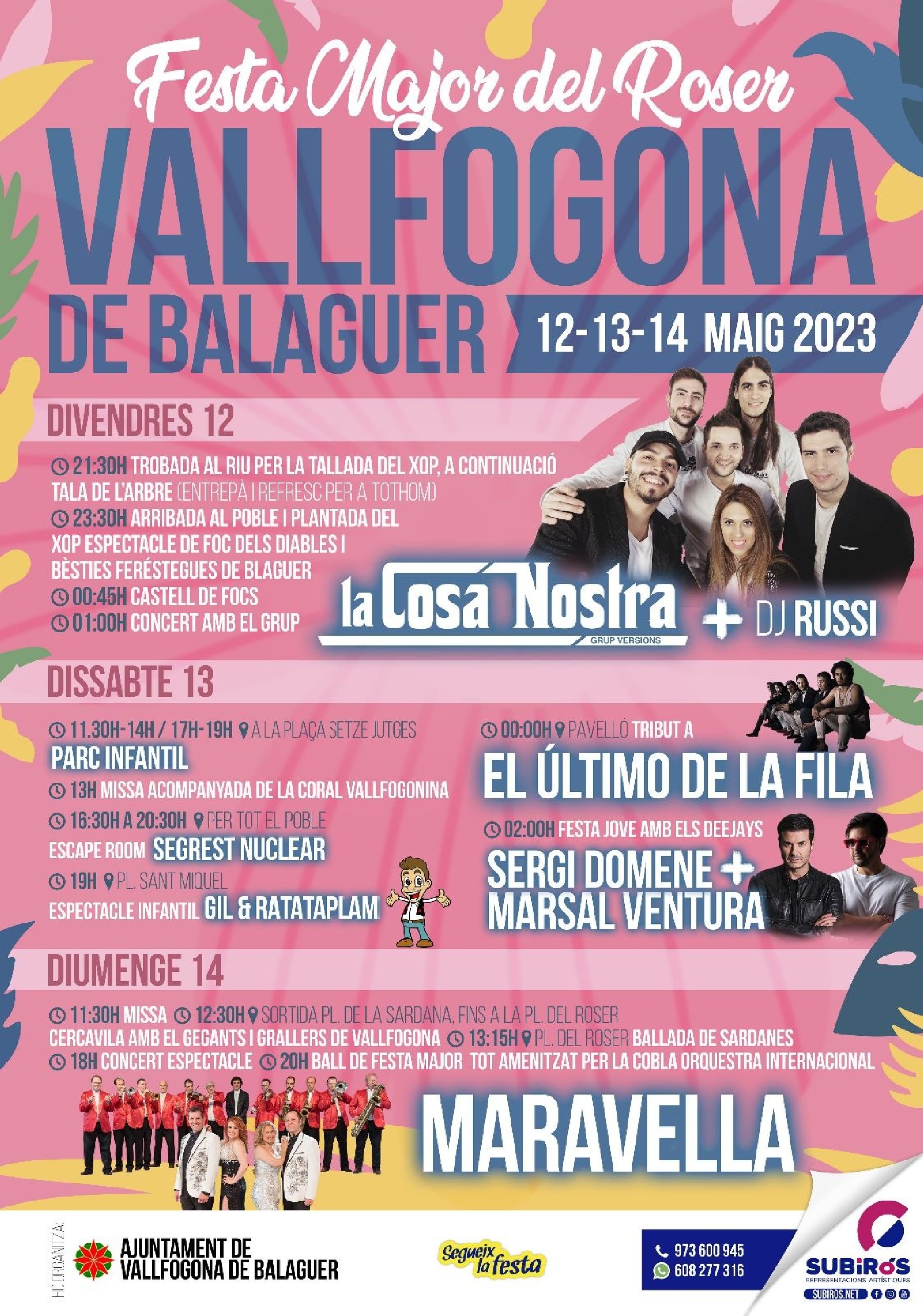 Vallfogona de Balaguer celebrarà aquest cap de setmana la seva Festa Major, en la que destaca el divendres la tradicional Plantada del Xop. Els concerts, djs i ball es combinaran amb activitats familiars en un complet programa d'actes