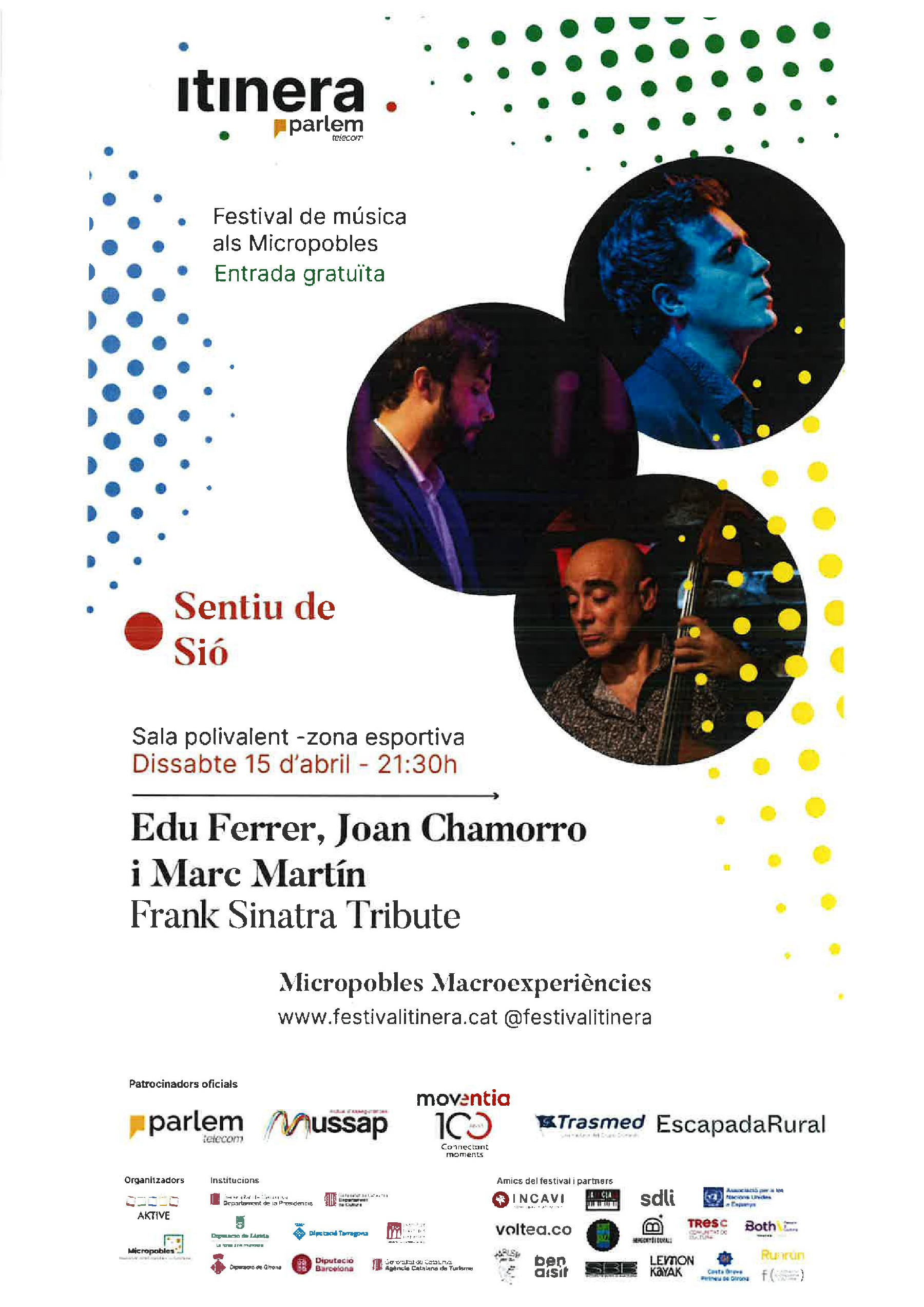 El Festival Itinera fa parada aquest dissabte a la Sentiu de Sió. Serà a 2/4 de 10 del vespre a la Sala Polivalent i amb el concert de Edu Ferrer, Joan Chamorro i Marc Martín i el seu tribut a Frank Sinatra