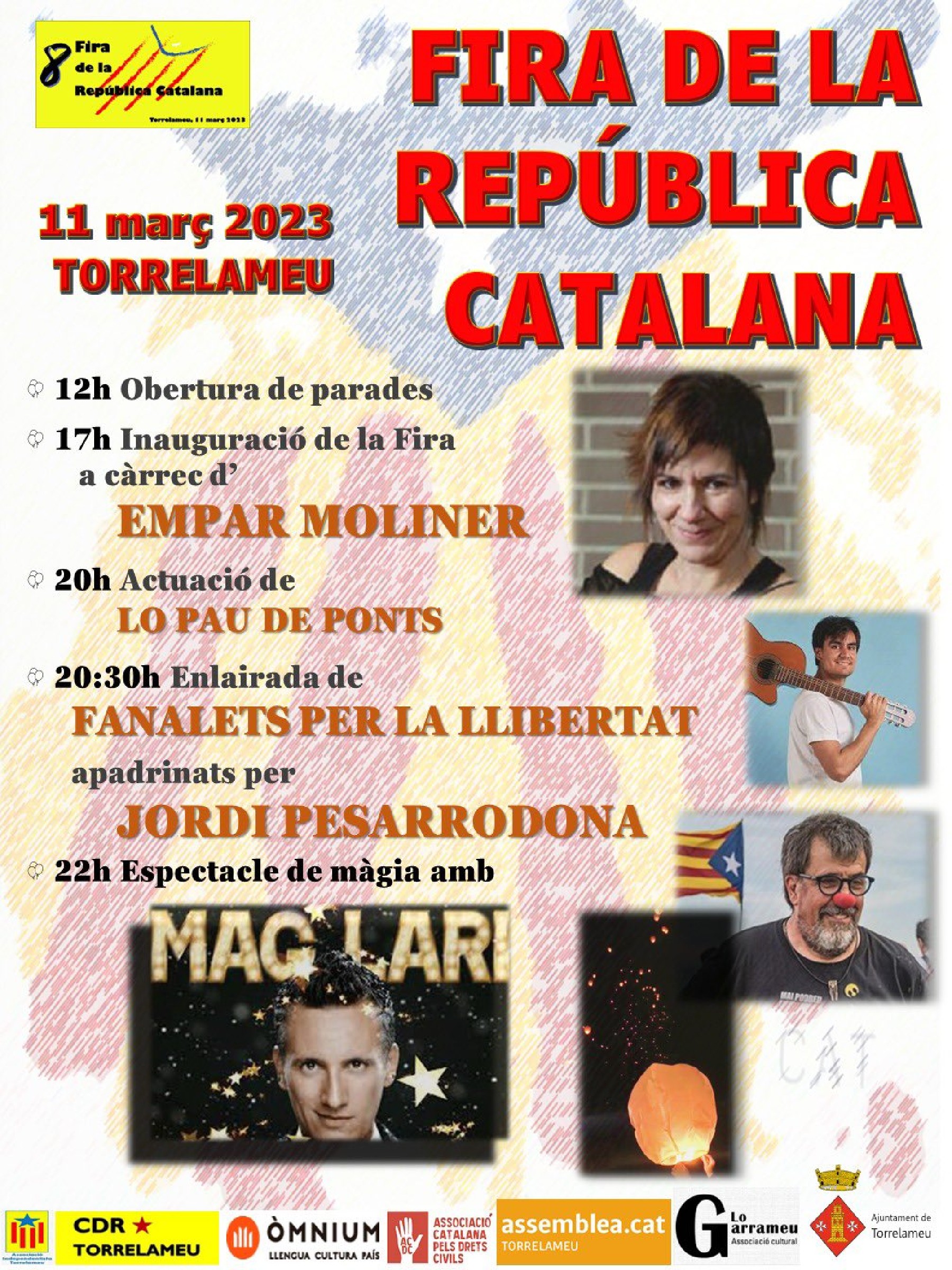 Torrelameu celebra la 8a Fira de la República Catalana. Tindrà lloc el dissabte 11 de març, amb una cinquantena de parades independentistes i de productes de proximitat, i la presència d'Empar Moliner i Jordi Pesarrodona, entre d'altres
