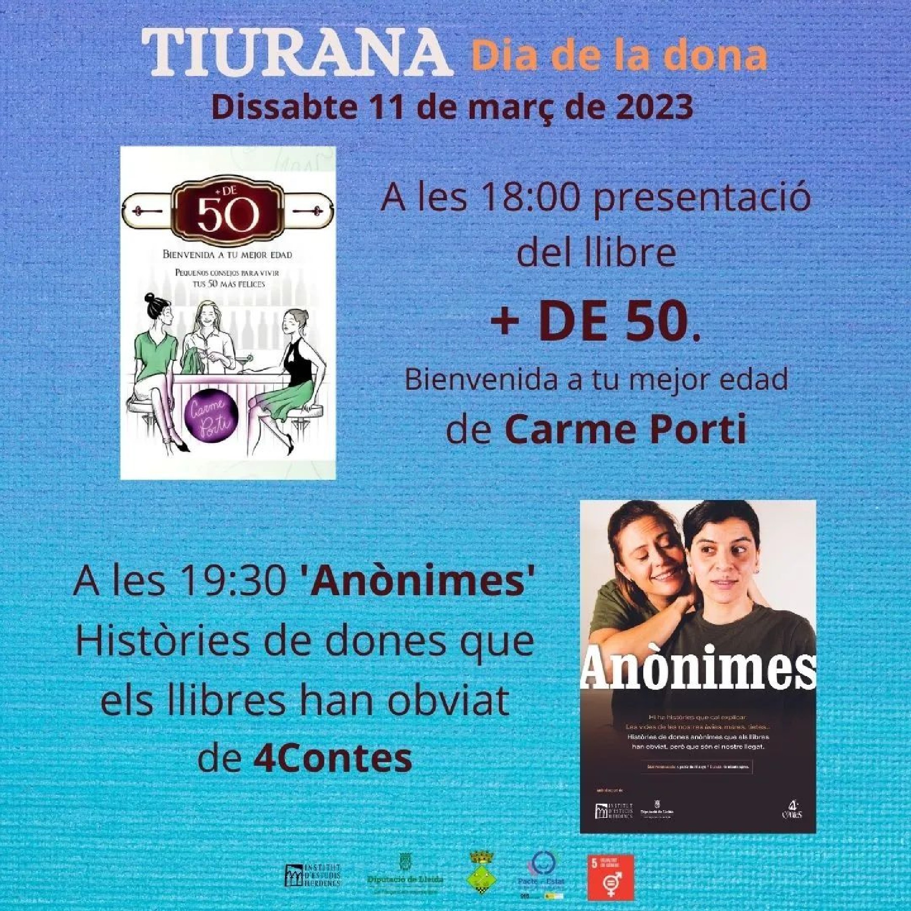 A Tiurana i en el marc dels actes del 8M es fan dues activitats aquest dissabte. Es presentarà el llibre 'de 50, bienvenida a tu major edad' i i es realitzarà la lectura dramatitzada de 'Anònimes, històries de dones que els llibres han obviat'